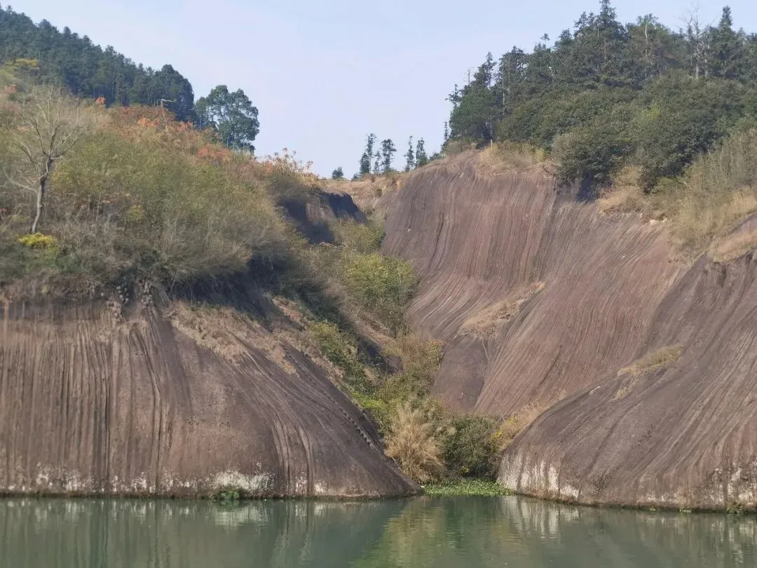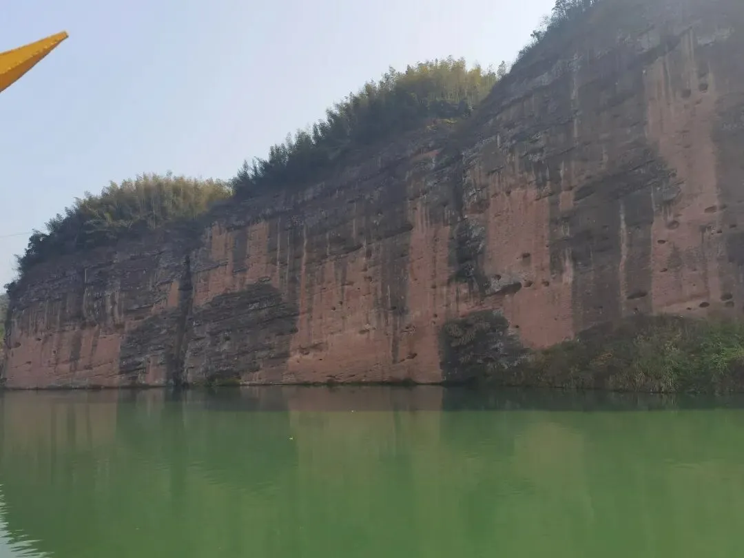乘船泛游便江,行至庚垅码头一带,目光会被对岸的赤色岩壁骤然吸引。数百米长的山体临江一侧,岩层垂直陡峭,经千万年风雨侵蚀与江水冲刷,形成了层次分明的肌理:赭红色的赤壁如烈焰凝固,间杂着深灰的岩纹与青黑色的苔藓,仿佛大自然以刀为笔,在岩壁上刻下岁月的沧桑。岩顶覆盖着苍翠的竹木,墨绿与丹红相映,为硬朗的山体注入生机。若遇晴日,阳光洒在岩壁上,光影变幻间,赤色愈发浓烈,宛如火烧云坠入江面;若逢阴雨,云雾缭绕中,赤壁若隐若现,又添几分缥缈仙气。