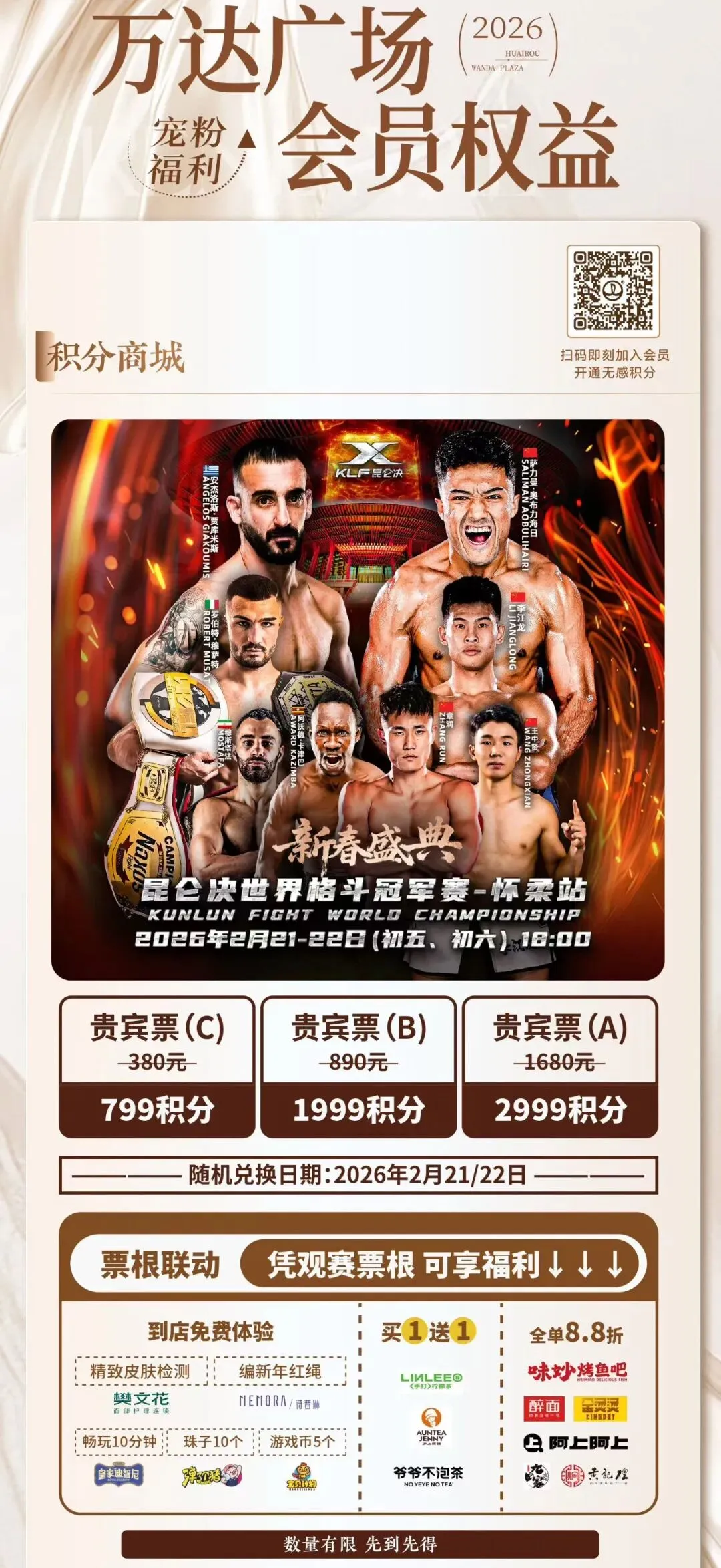 万达与昆仑决的联动福利更是掀起消费热潮,积分兑换赛事门票、票根享商圈优惠,实现消费与观赛双向引流,新春消费热情持续高涨。