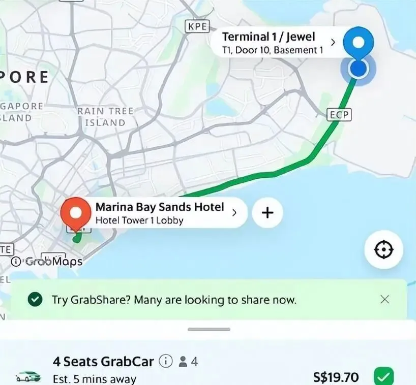 从机场用grab打车到金沙酒店,车费要20新币(大概110人民币),这还是在非高峰时间,要是碰上高峰期,估计得多出一倍,得折腾到40新币!