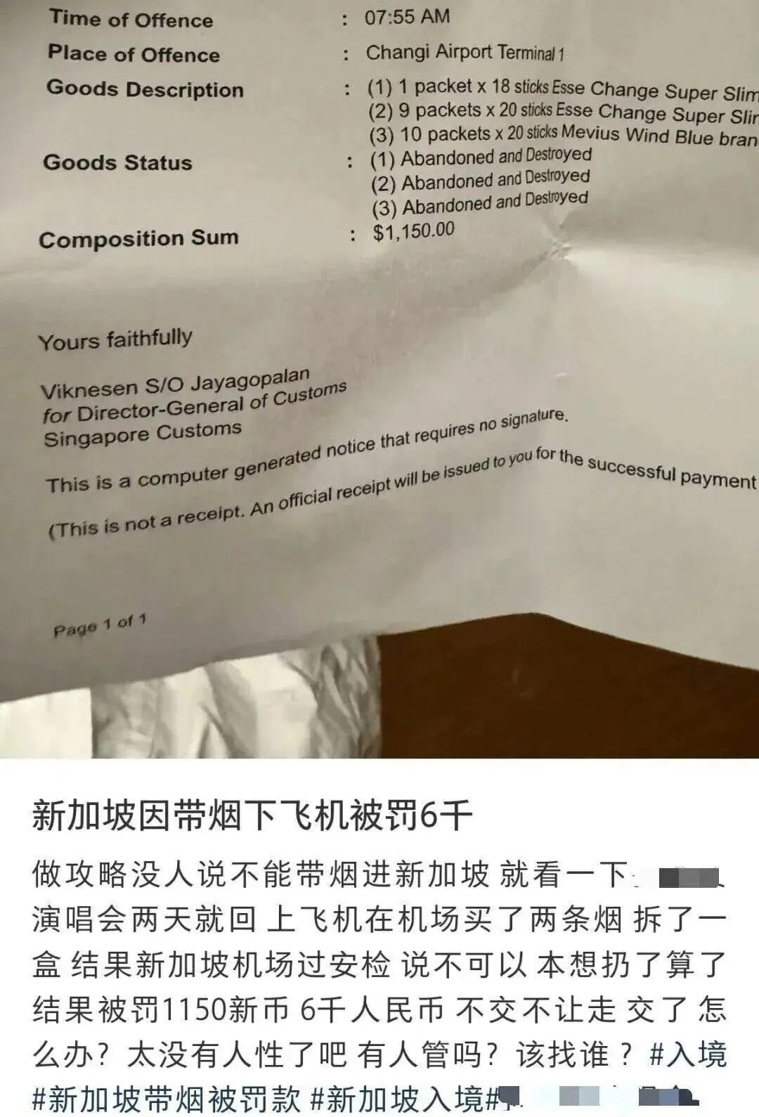 他本打算认了,把烟扔掉就行了,没想到工作人员却直接开出罚单——1150新币!折算成人民币差不多得六千块左右!