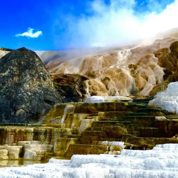 大猛犸热泉也被称为蛋糕温泉,是最活跃的,也是存在时间最久远的地热区。多个热泉从高处的泉眼涌出,冒着蒸汽从山坡上一节一节地向下流淌,在每一层的沉积池里沉积、转换、填满,伴随着各种各样的细菌被染得五颜六色。可惜的是,在2002年的一次地壳运动后,这里大部分热泉停止了活动,色彩缤纷的微生物大量死亡。猛犸象热泉由此失去了颜色,只遗留下灰白色的粉末,让人惋惜。而日落时分,夕阳西下,是感受蛋糕温泉最佳的时候。人潮散去,安静惬意,就像黄石在跟你细细的倾诉它的故事。