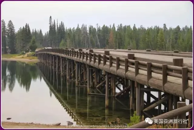 钓鱼桥横跨黄石河,而在桥上我们可以看到野生的鳟鱼在湖中跳跃,非常的生猛,据说地热曾经把鳟鱼都活生生煮熟了。尽管钓鱼桥上不能钓鱼,但是确实一个观鱼的绝佳好地方。