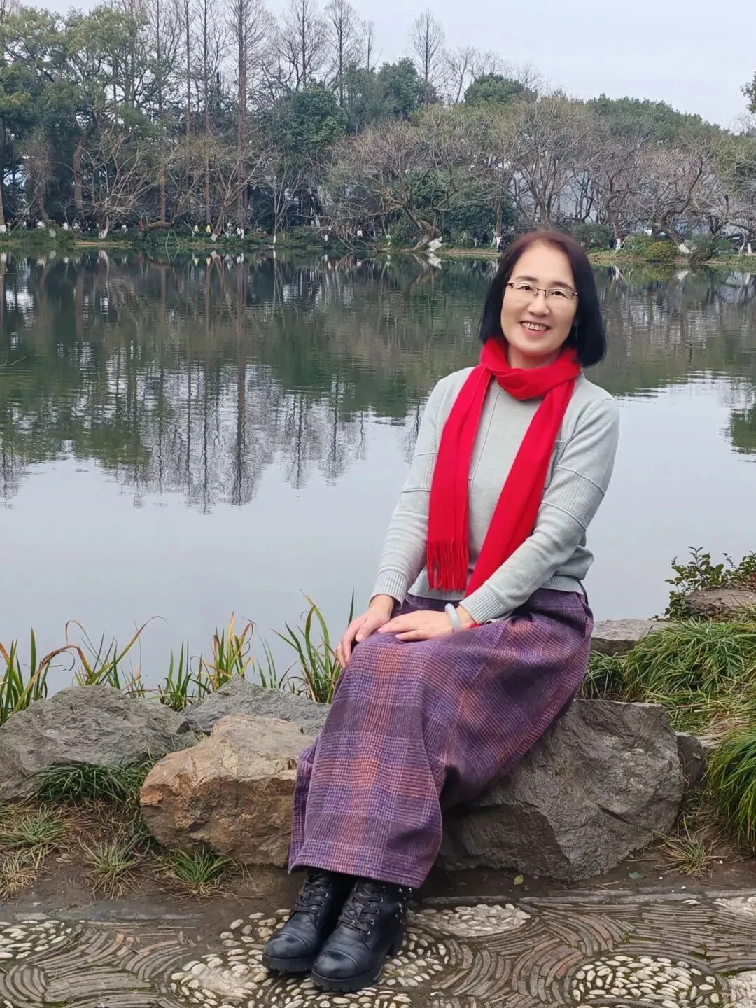 静坐的姿态最能凸显知性温柔,没有站立的紧绷感,搭配周边绿植、湖水,画面安静又治愈,把岁月沉淀的柔美尽数展现。
