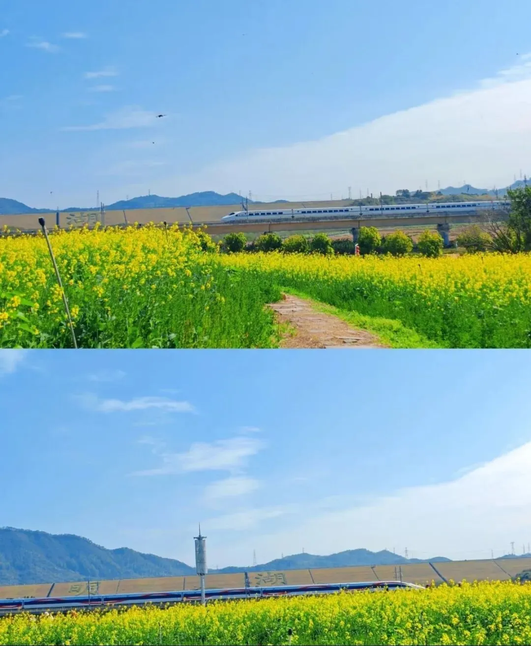 大片大片的油菜花顺着地势铺展开来,一眼望不到边,在阳光下金灿灿地发亮。风轻轻吹过,花田像金色的海浪一样起伏,空气里都是淡淡的、清新的花香。没有嘈杂的叫卖,没有拥挤的人潮,只有鸟鸣、风声,和远处偶尔驶过的小火车,安静又治愈。