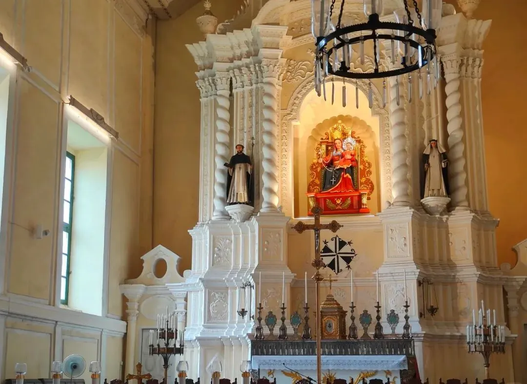 3.玫瑰堂:玫瑰堂(葡萄牙语:Igreja de S. Domingos),别名玫瑰圣母堂、板障庙、板樟(障)堂、圣多明我堂,位于中国澳门特别行政区大堂区板樟堂前地,建于1587年。玫瑰堂立面四层,构图形式对称,第三层多明我修会会徽居中,显得庄严神圣。内部建筑平面呈巴西利卡式,有中厅和侧廊。主祭坛深远开阔,层叠的壁柱间以扭曲的麻花柱,断山花辅以蜿蜒的线脚,形成巴洛克风格。