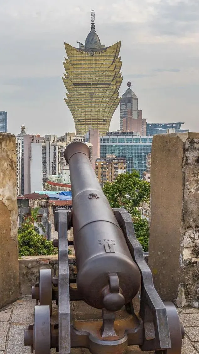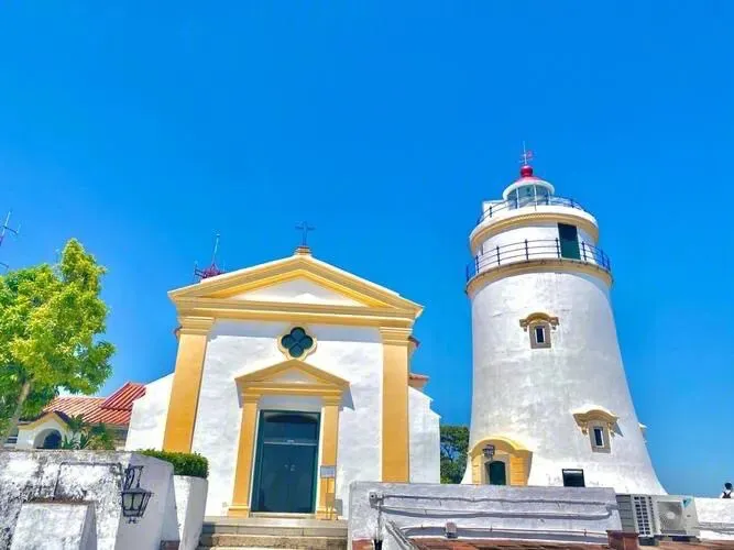 4.东望洋炮台:东望洋炮台(葡萄牙语:Fortaleza da Guia)又称松山炮台、东望洋山炮台,位于中国澳门特别行政区大堂区东望洋山,建于十七世纪,为澳门八景之一的“灯塔松涛”。东望洋炮台包括东望洋炮台、圣母雪地殿圣堂及东望洋灯塔。东望洋炮台位于澳门半岛最高峰东望洋山之巅,俯瞰整个半岛;圣母雪地殿圣堂教堂内的拱顶和墙身绘有彩色壁画,其绘画技巧融合中西艺术,彰显教堂之价值;东望洋灯塔为中国海岸第一座现代灯塔。