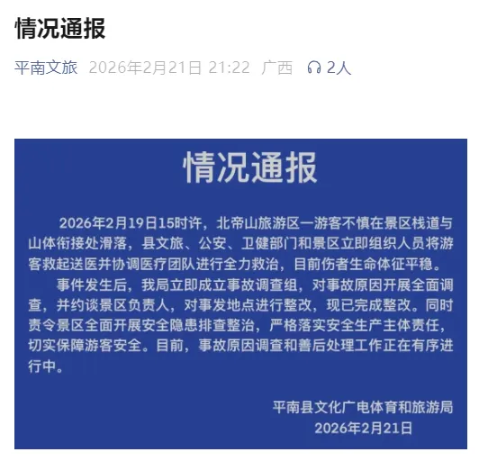 2月21日晚,广西贵港市平南县文旅局就“10岁男孩在广西北帝山景区栈道踩空坠下”一事发布情况通报。 通报称,2026年2月19日15时许,北帝山旅游区一游客不慎在景区栈道与山体衔接处滑落,县文旅、公安、卫健部门和景区立即组织人员将游客救起送医并协调医疗团队进行全力救治,目前伤者生命体征平稳。