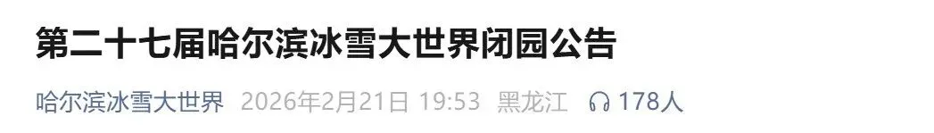 2月21日晚,哈尔滨冰雪大世界发布闭园公告: