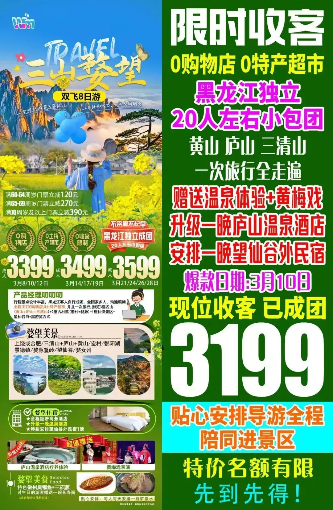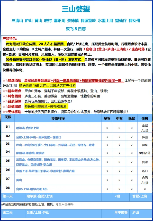 【肇东纵横旅游春季团】3月10号三山婺望 双飞8日游 黄山+庐山+三清山+婺源+望仙谷 黑龙江独立成团