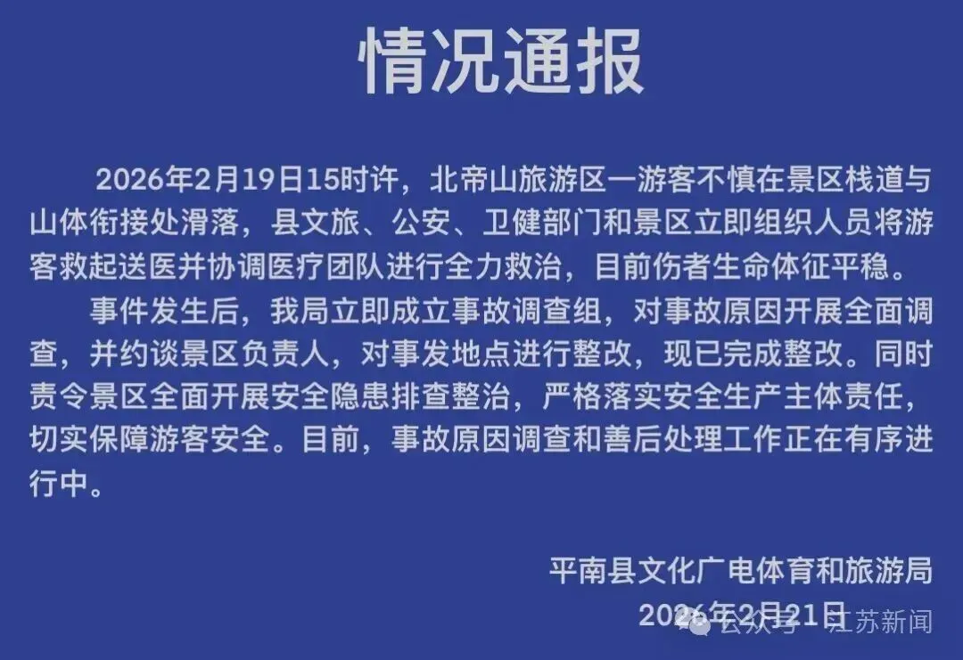 2月21日晚,广西平南文旅就“10岁男孩在广西北帝山景区栈道踩空坠下”一事发布情况通报: