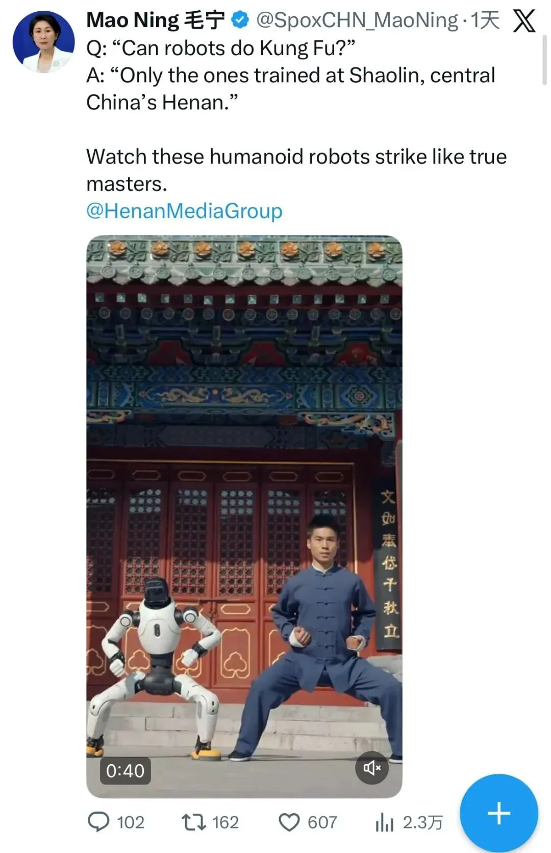 2月19日,外交部发言人毛宁在MetaPage等海外社交平台的个人账号发布2026河南春晚《功夫机缘》,并配文:“机器人也会功夫吗?只有在中国中部河南练就一身本领的机器人才行。”随后,外交部发言人办公室转发相关内容,向全世界推介。