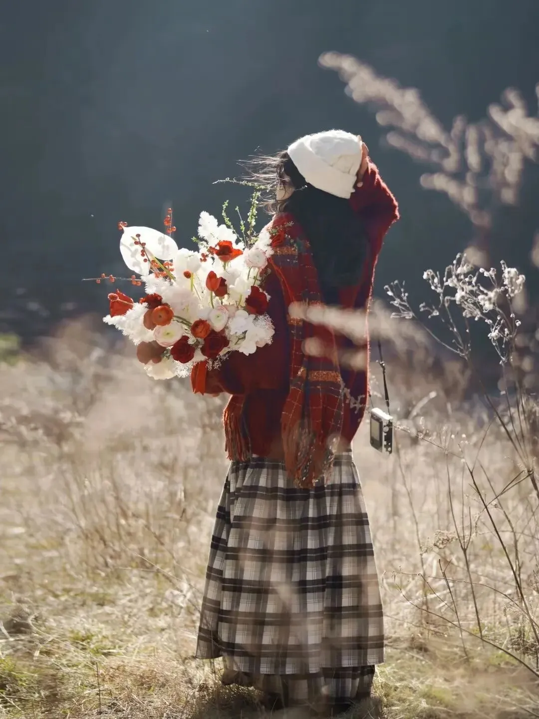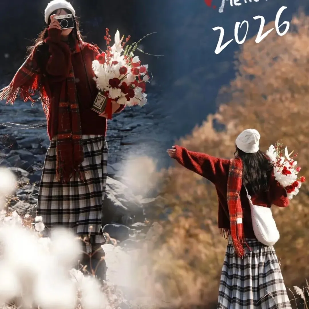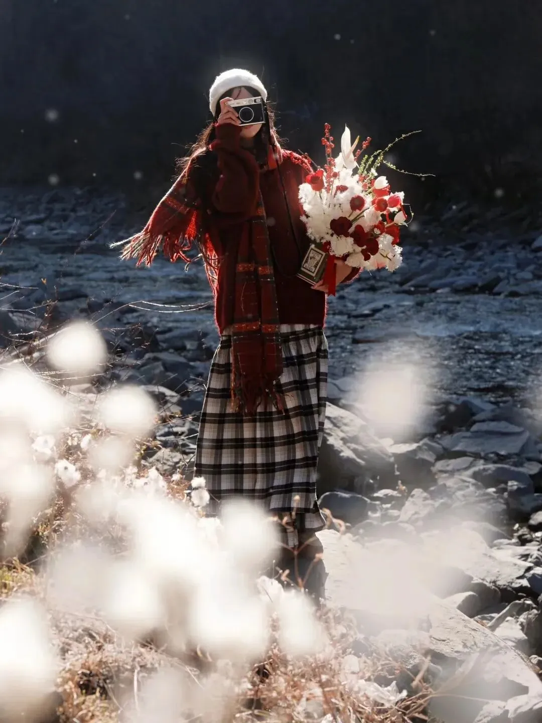 春节期间,红衣最是应景。若不想拍出千篇一律的新春照,不妨在出游山川郊外时,尝试今天分享的这组——用不露脸的方式,拍出独属于自己的神秘感。节日氛围依旧浓厚,却多了几分唯美诗意。空旷天地间,红衣和花点亮整个画面,成为最动人的焦点。
