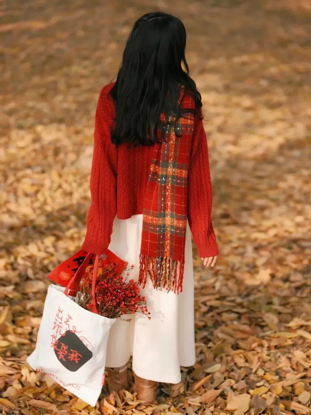 镜头在人物背后。全景。居中。长焦俯拍,以满地落叶为背景,画面简洁而温暖。地面的光影丰富了视觉层次。一手将装有红花与新年贴画的提包拎在身后,与身上的红衣一同烘出浓浓年味;另一手自然垂落。丁字步的站姿让背影更显灵动,低头望向脚下的落叶,静谧中藏着故事。