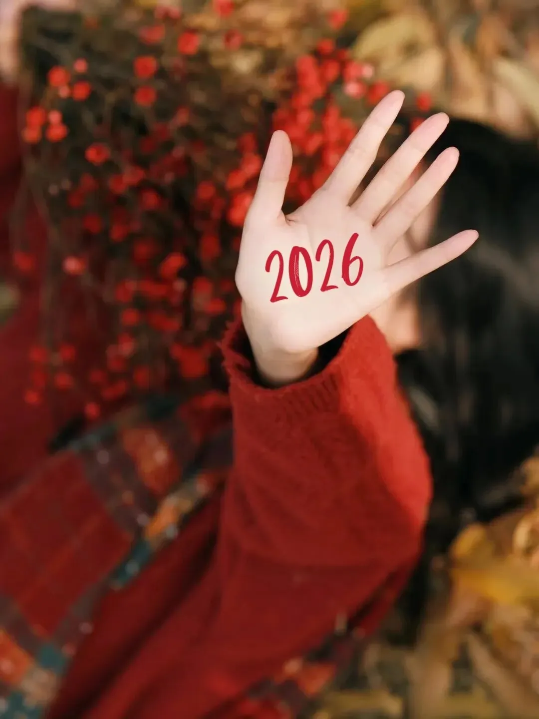 五 手部特写 镜头在人物左上方。中景特写。长焦俯拍,轻轻躺在一片落叶之上。怀中那束红花静静盛开,与周身暖色落叶一同烘出温柔的新年氛围。一只手伸向镜头,恰到好处地挡住脸庞,神秘感在指缝间悄然流露。后期可配以文字,为画面再添一抹节日温度。