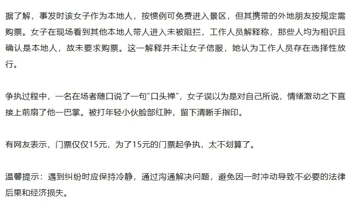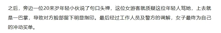 之后,旁边一位20来岁年轻小伙说了句口头禅,这位女游客就质疑这位年轻人骂她,上去就是一巴掌,导致对方脸部留下明显指印。最后经过工作人员及警方的调解,女子最终为自己的冲动买单。