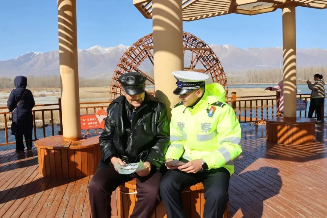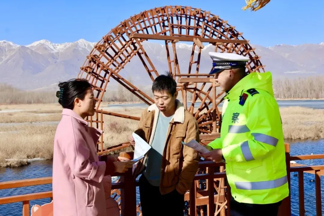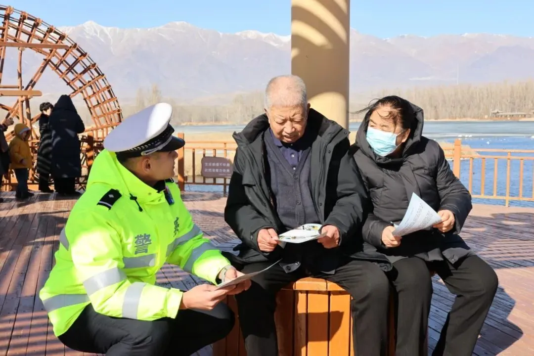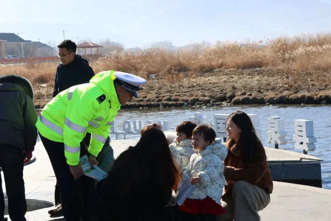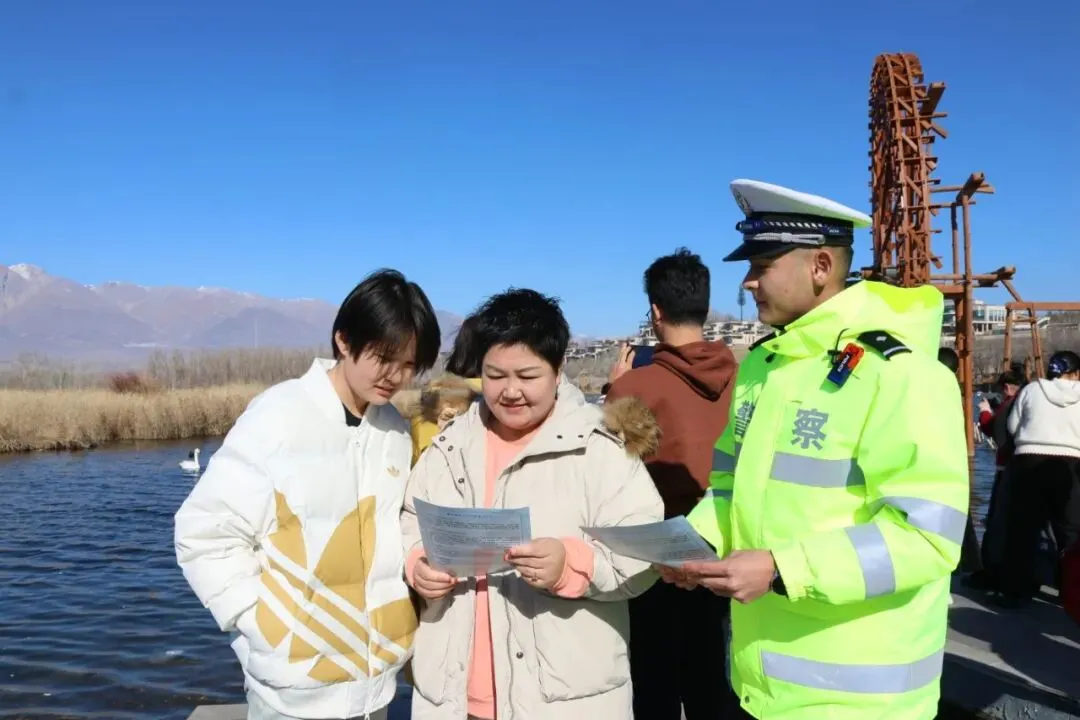 活动中,宣传民辅警在景区入口、游客集散中心、停车场等人员密集区域发放宣传资料、面对面讲解、现场答疑等形式,向过往游客、自驾车主普及冬季出行与景区道路安全常识。