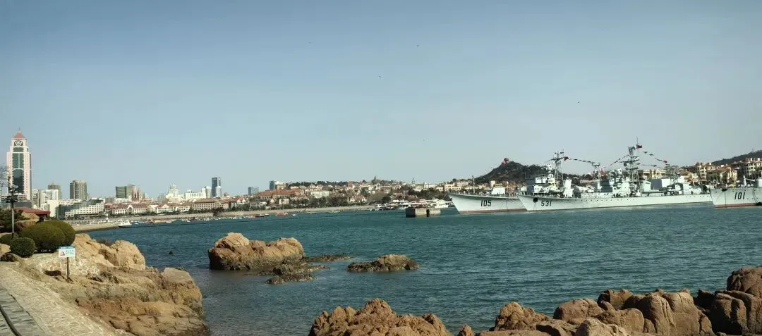 这是一个很特别的角度,楼群之间,可以看到宽阔的海面,军舰和栈桥都在其中,这是我前段时间一个人走路时发现的,(第一次发现这个角度写的公众号)。队友果然很意外,拿出手机拍了不少照片。