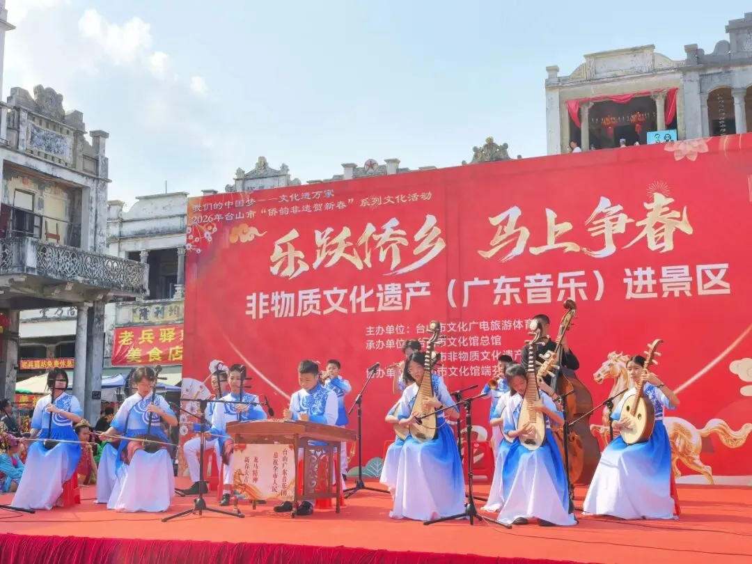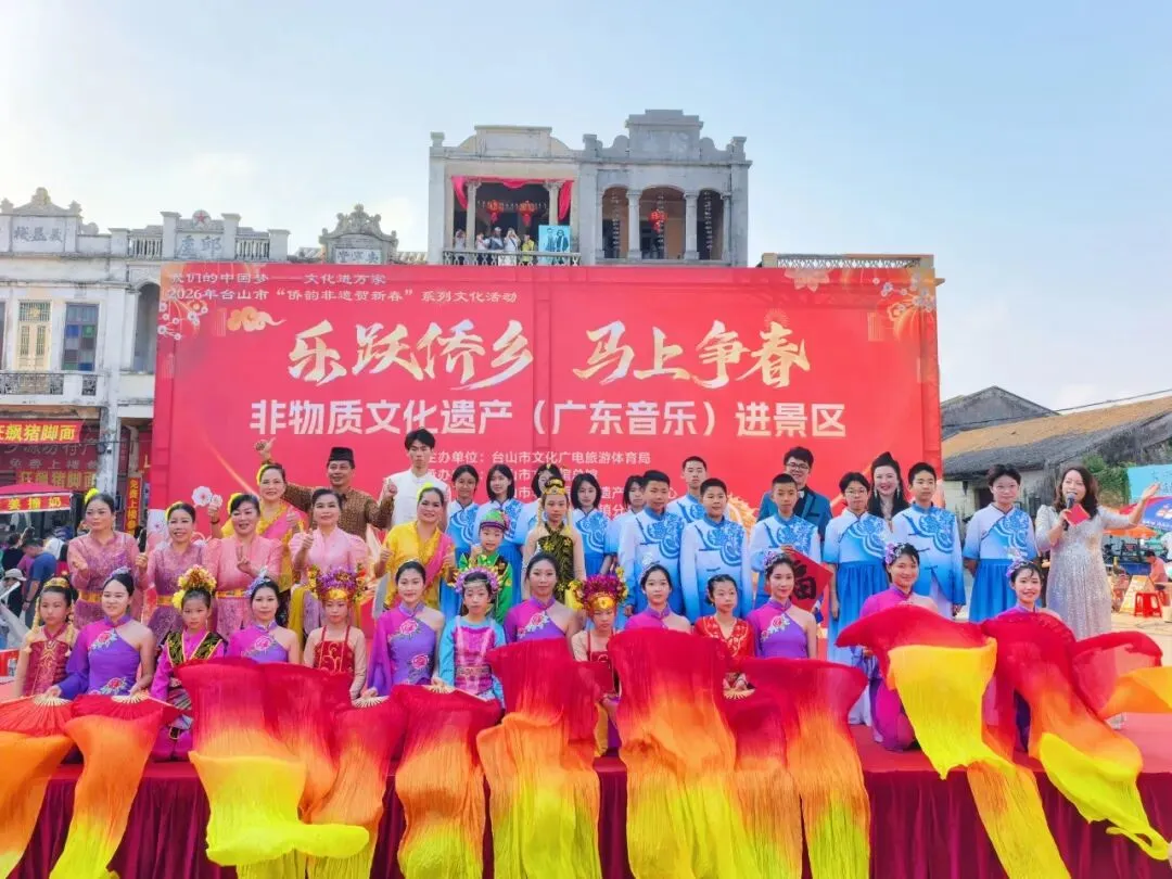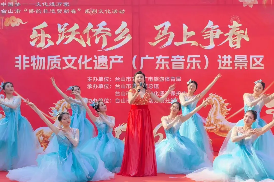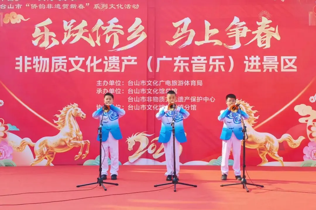 2月21日年初五下午,由台山市文化广电旅游体育局主办,台山市文化馆总馆和台山市非物质文化遗产保护中心承办,台山市文化馆端芬镇分馆协办的“乐跃侨乡 马上争春”非物质文化遗产(广东音乐)进景区活动在端芬镇梅家大院热闹上演,为市民游客带来了一场融合非遗经典和侨乡风情的新春文艺演出。