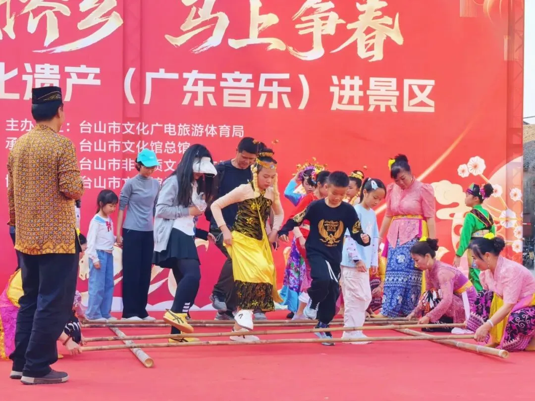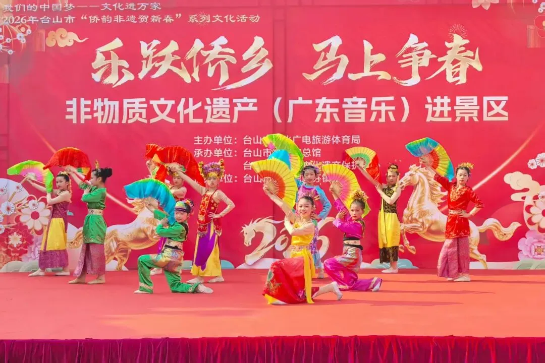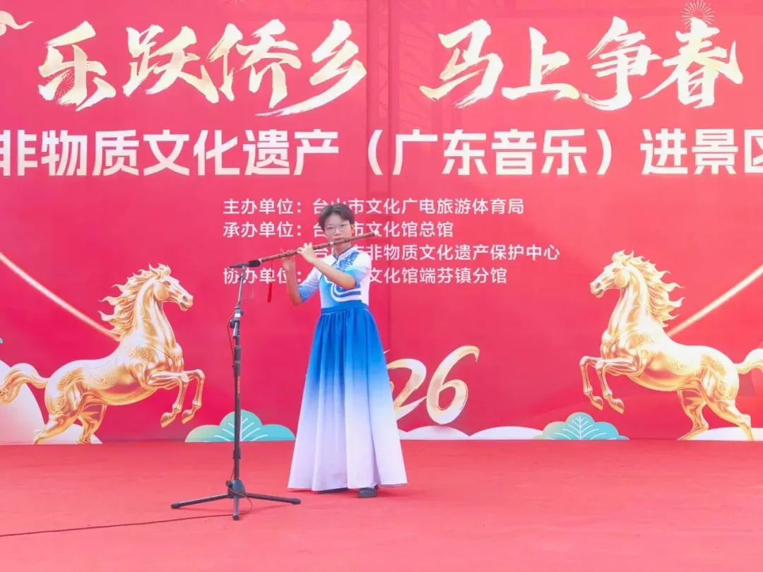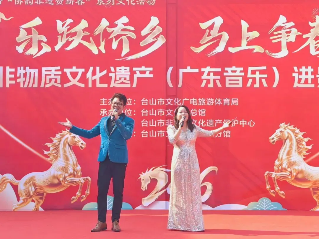 2月21日年初五下午,由台山市文化广电旅游体育局主办,台山市文化馆总馆和台山市非物质文化遗产保护中心承办,台山市文化馆端芬镇分馆协办的“乐跃侨乡 马上争春”非物质文化遗产(广东音乐)进景区活动在端芬镇梅家大院热闹上演,为市民游客带来了一场融合非遗经典和侨乡风情的新春文艺演出。