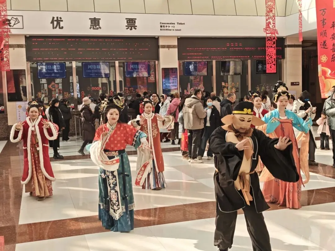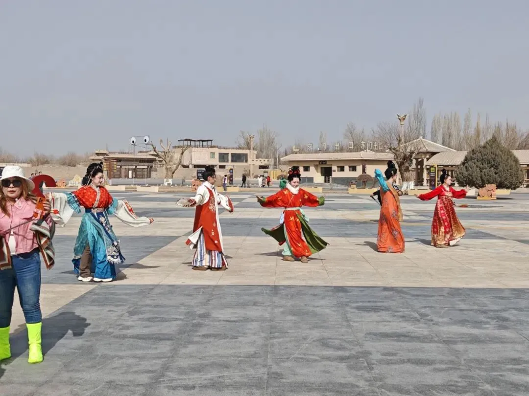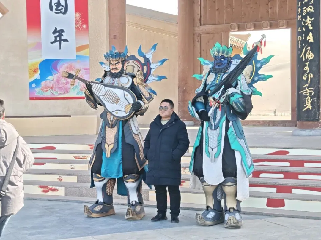 景区新春舞蹈串烧演出深受游客喜爱,舞者身着鲜艳贺岁服饰,将传统新春元素与敦煌民俗风情融入舞蹈,动作灵动舒展、充满活力,游客纷纷驻足观看,还主动加入共舞,现场满是欢声笑语。“四大天王” 机甲的登场更是惊喜满满,数米高的机甲融入敦煌文化元素,兼具科技感与传统韵味,在景区内穿梭互动、与游客挥手合影,引得大家争相拍摄,小朋友欢呼雀跃,现场互动热烈、喝彩不断。
