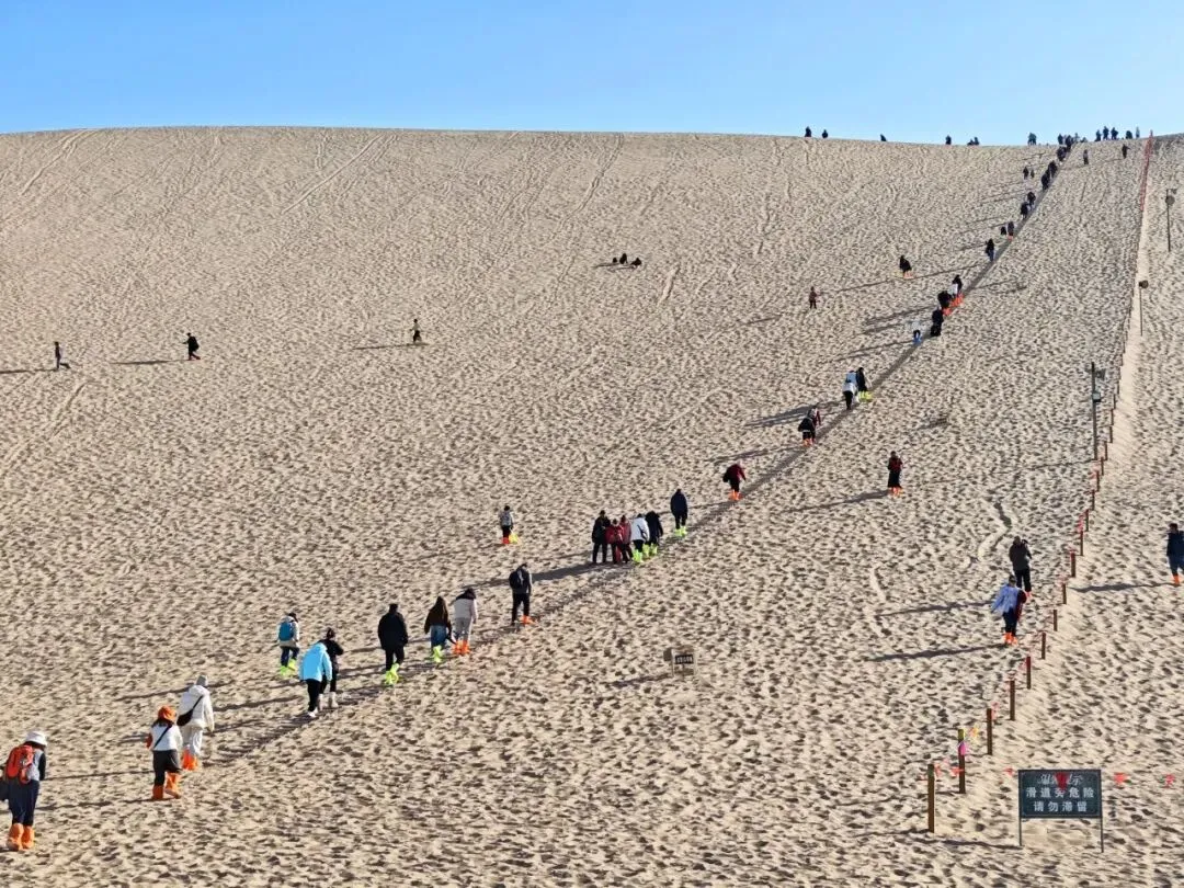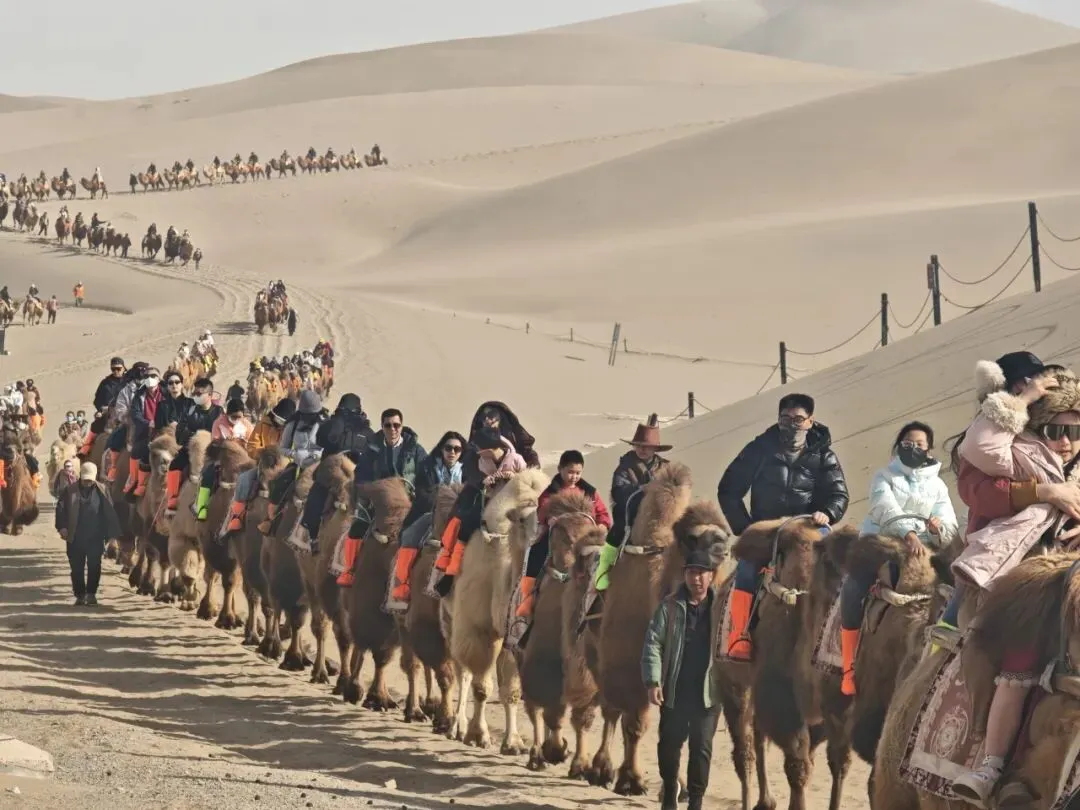 鸣沙山的巍峨壮阔,月牙泉的清澈秀美,为节日增添了别样的韵味。景区内人头攒动,热闹非凡。夕阳余晖下,金色的沙山、静谧的泉水与热闹的活动交相辉映,阵阵驼铃回荡在沙海之间,让游客在感受节日喜庆氛围的同时,也能沉浸式领略沙泉相依的独特自然奇观。