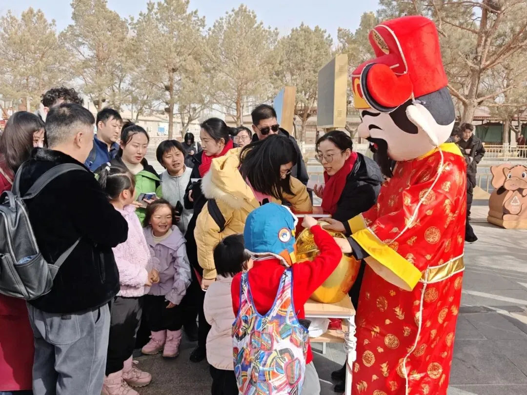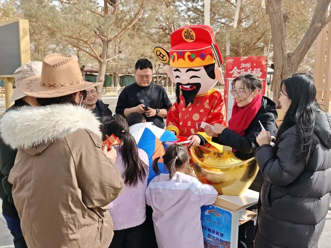 春节假期的鸣沙山月牙泉,既有沙岭晴鸣的壮阔景致,更有欢声笑语的节日氛围。恰逢大年初五迎财神,景区入口的套票抽奖点人气爆棚,身着吉服的财神爷热情互动,游客们纷纷上前打卡参与,把满满的福气与财气收入囊中。