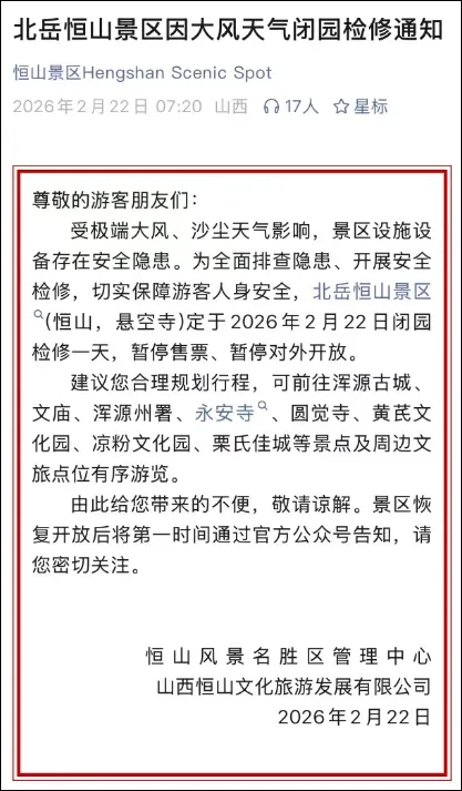 21日中午,恒山景区发布紧急公告称,景区即刻起停止线上、线下售票,暂停对外开放。今天一早,受极端大风、沙尘天气影响,景区再发公告,北岳恒山景区(恒山,悬空寺)闭园检修一天。