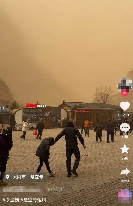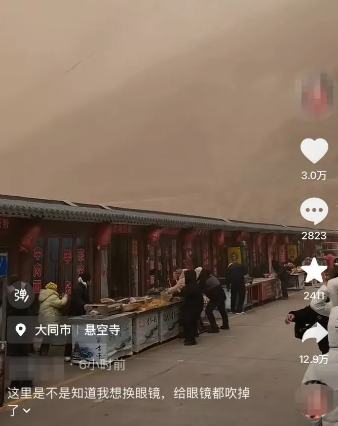沙尘暴席卷多地,众多景区紧急关闭,悬空寺山脚下黄沙漫天、商品被大风吹跑