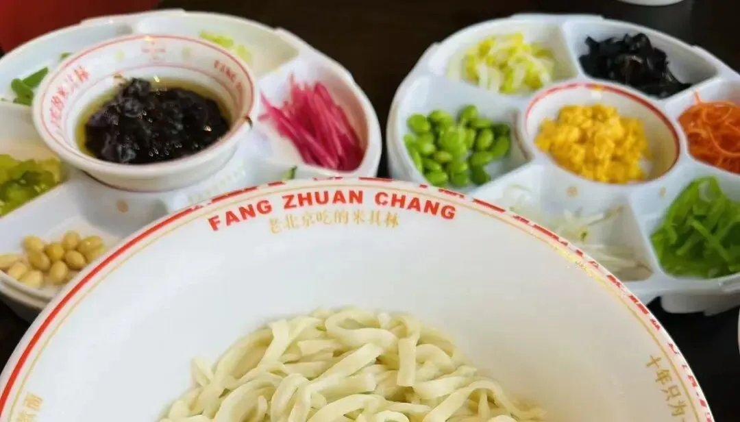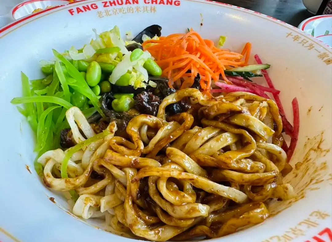 从箭楼下来,又顺便逛了逛前面大街、大栅栏,感觉变化还挺大的。由于天气实在太冷风太大了,我只穿了件大衣,有点扛不住了。方砖厂69号炸酱面必须吃起来,从小我就喜欢谢霆锋,他打卡过的店我都会去光顾。这家炸酱面的酱有两种,一种是用黑猪肉做的,一种是普通猪肉,价格不同,菜码也不同,黑猪肉的有两盘菜码,普通的是一盘菜码。扫码点关注还赠送了一碗鱼丸紫菜汤。吃完整个人都暖和了不少。
