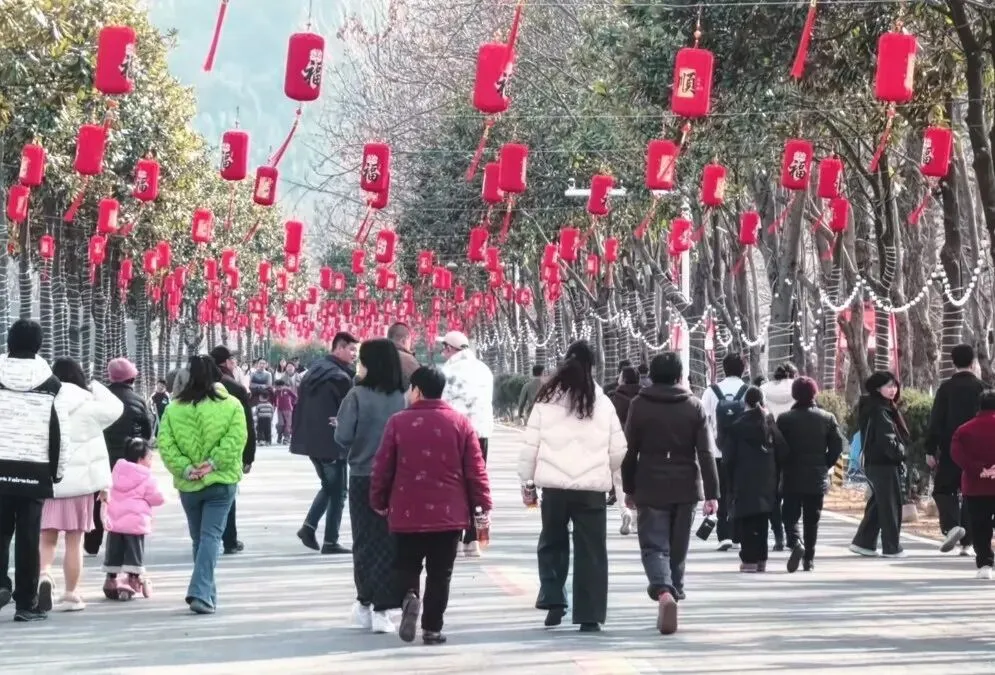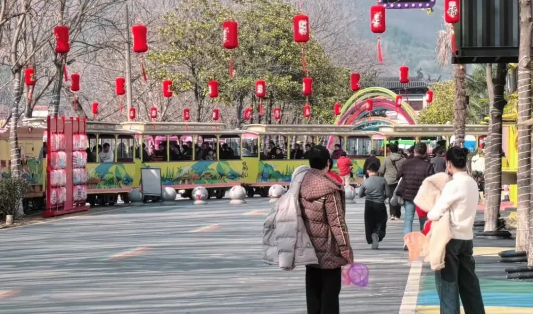 走进步道,沿途挂满了红彤彤的灯笼,猜灯谜互动吸引了众多游客驻足。大家三五成群,或低头沉思,或争相揭晓谜底,答对者还能赢取小礼品。不远处的小火车满载欢声笑语,穿梭在山水之间,成为一道流动的风景线。