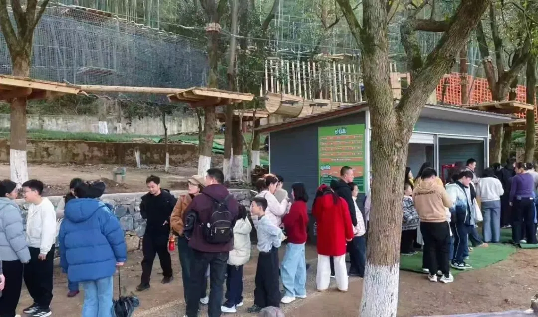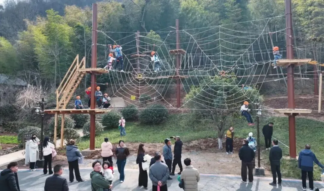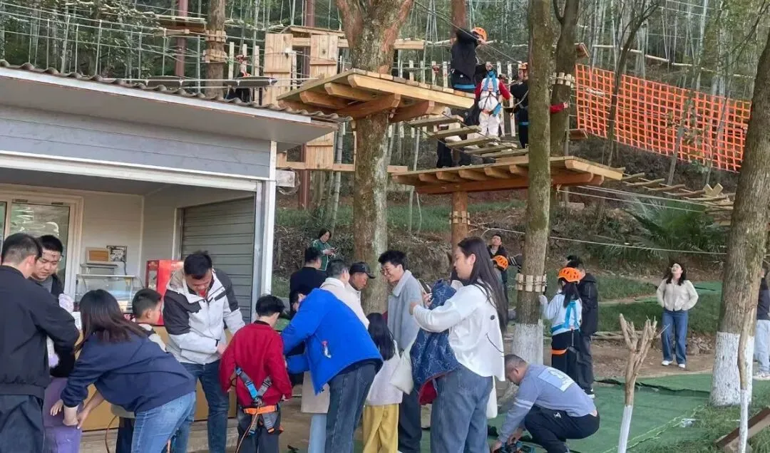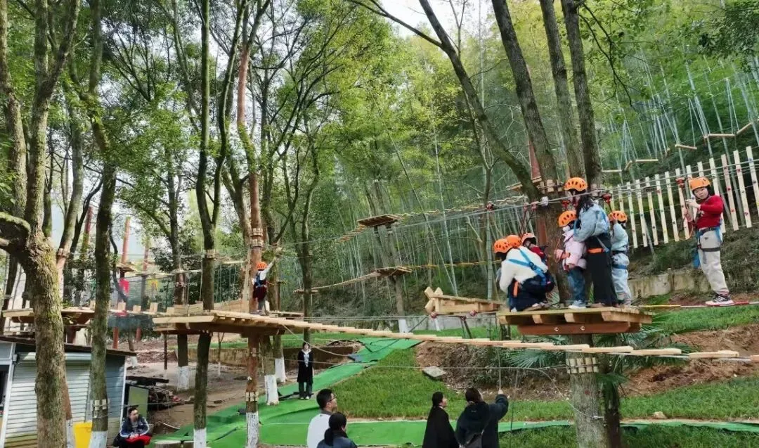 今年新增的 “野趣丛林探险” 项目成了妥妥的“人气王”。一大早,项目入口就排起了长龙,家长们带着孩子跃跃欲试。惊险刺激的关卡设计,不仅锻炼了孩子的胆量和勇气,更成为亲子家庭的最爱。悬索桥、攀爬网、滑索……每通过一关,孩子们都欢呼雀跃,欢笑声回荡山林,现场气氛热烈非凡。