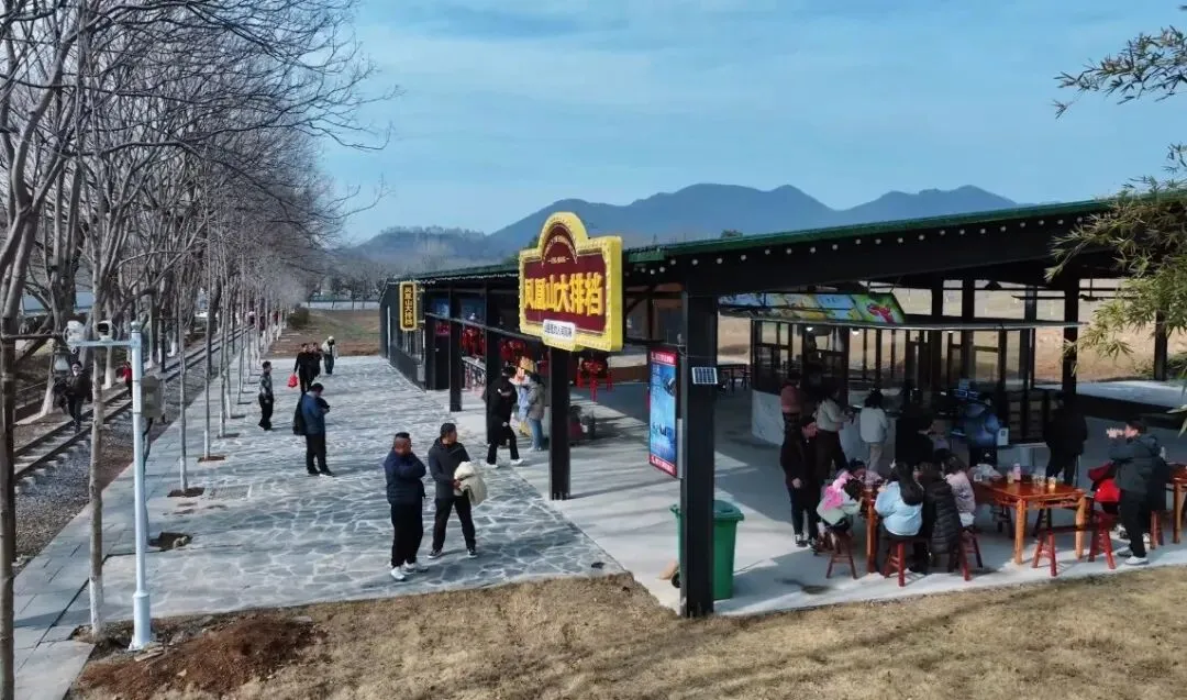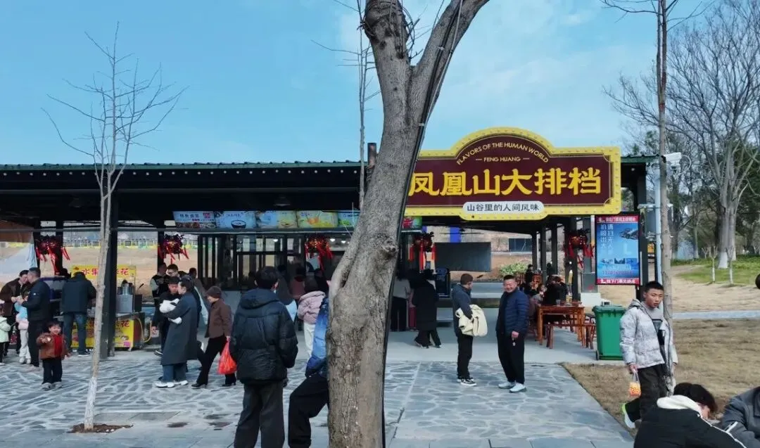 逛累了?凤凰山大排档早已人声鼎沸。本地农家菜、网红美食、传统年味点心……餐桌上挤满了品尝的游客。热气腾腾的农家菜、滋滋作响的柴火饭、焦糯香脆的灶锅巴,味蕾的满足让年味更浓。