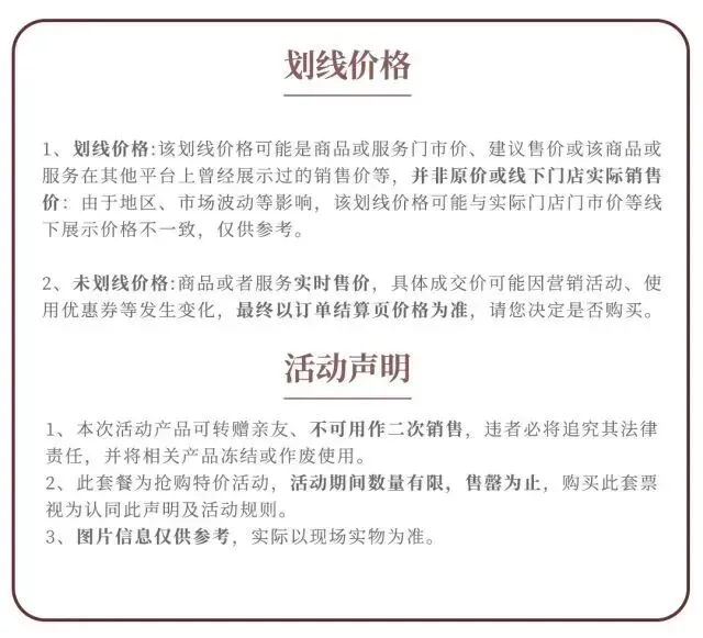 · 6、园内的餐饮、购物及其他增值服务为独立运营的二次消费项目,不包含在票务产品价格内。相关服务的价格、规格及购买条件均以各服务点现场的实时公示为准,请在消费前仔细确认。