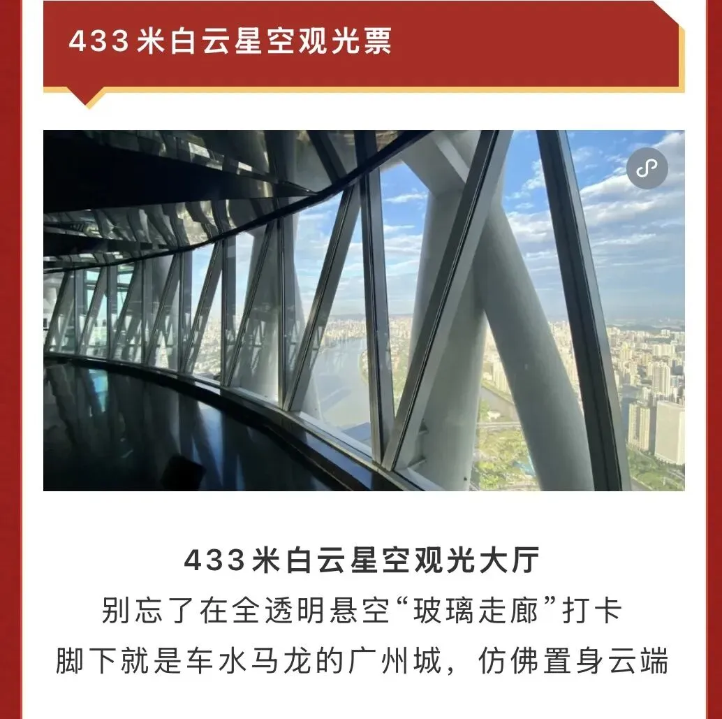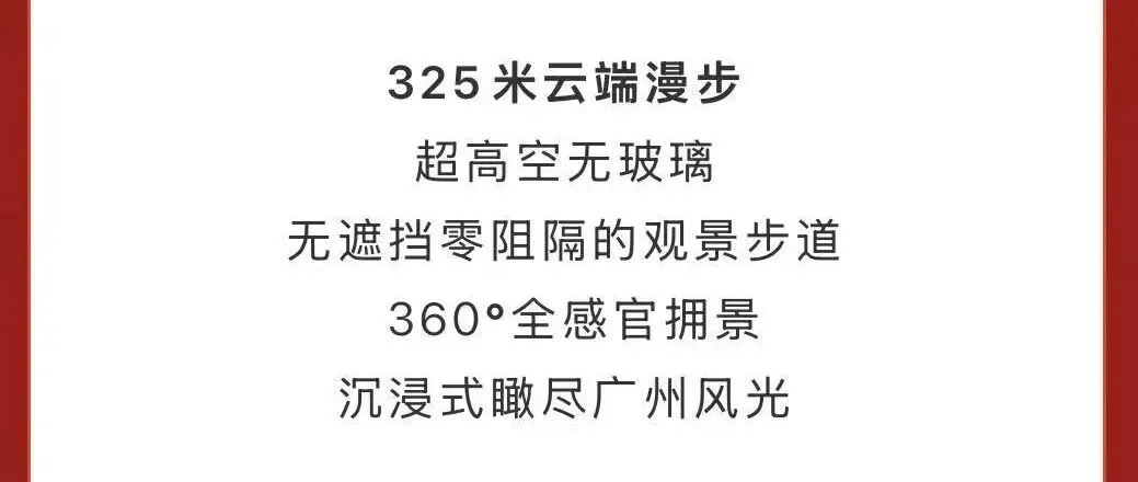 · 325米云端漫步:位于325米高空的超高空无玻璃、无遮挡、零阻隔观景步道。走在上面,360度全感官拥抱广州美景,沉浸式俯瞰城市风光,每一步都是心跳与美景的完美融合。