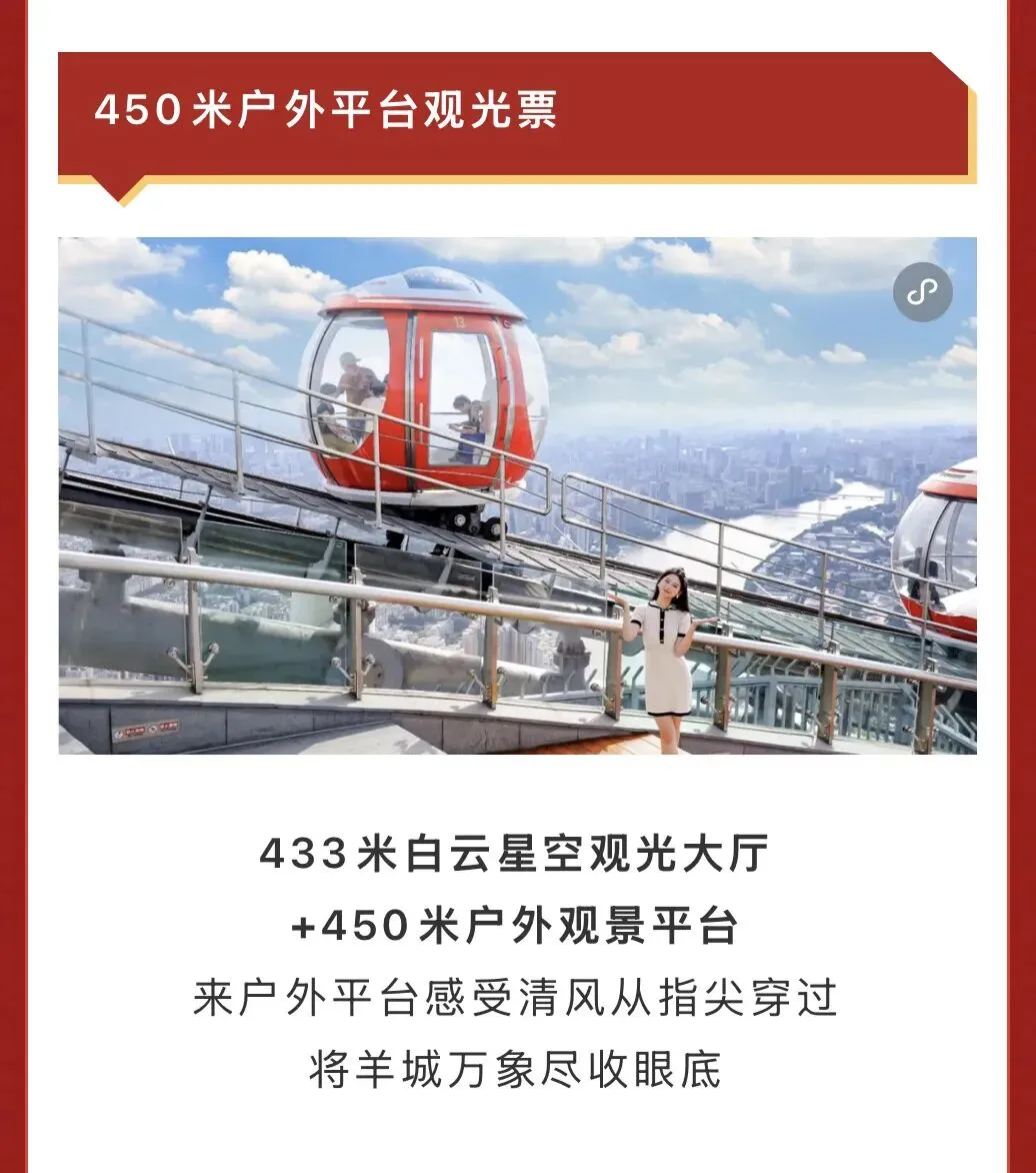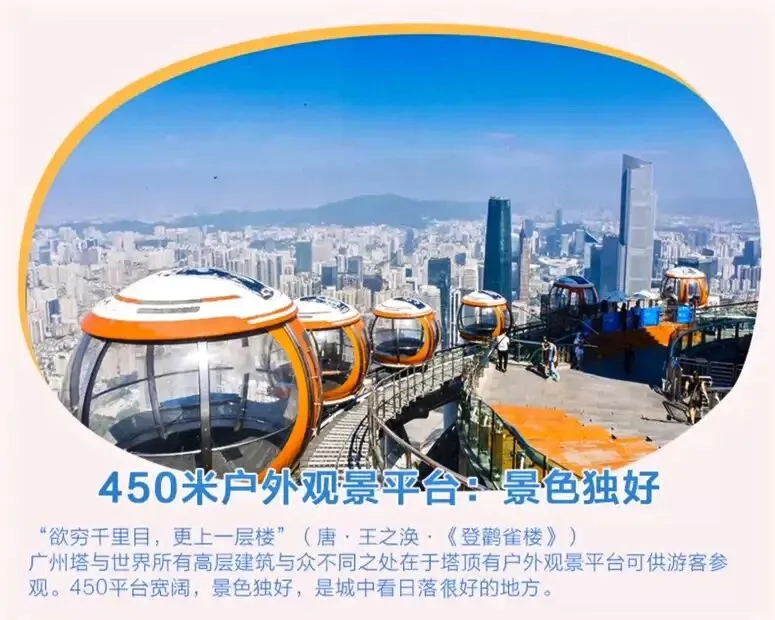 包含433米白云星空观光大厅及450米户外观景平台。从室内走向户外,清风从指尖轻轻穿过,羊城万象尽收眼底。450米的高度让你能够更加真切地感受高空环境,视野更加开阔,是感受广州塔魅力的升级之选。