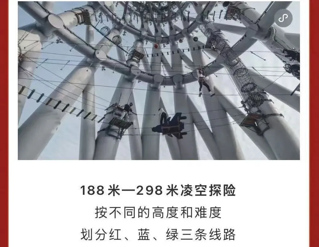· 188米-298米凌空探险:根据不同高度和难度,划分为红、蓝、绿三条线路。无论你是初次尝试高空项目的“小白”,还是经验丰富的“老手”,都能找到适合自己的挑战。在确保安全的前提下,体验在高空穿梭的刺激与乐趣。