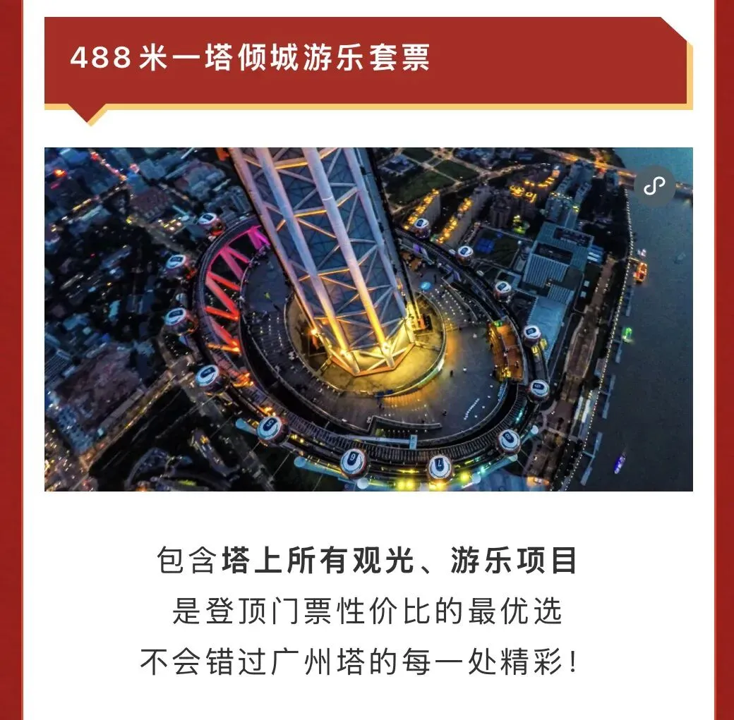 这是性价比最高的选择!包含塔上所有观光、游乐项目,让你一次玩个够,不会错过广州塔的每一处精彩。从观光到游乐,从室内到户外,从温柔浪漫到刺激惊险,一票在手,所有体验尽在掌握。如果你时间充裕、想要全面感受广州塔的魅力,选这个套票准没错!