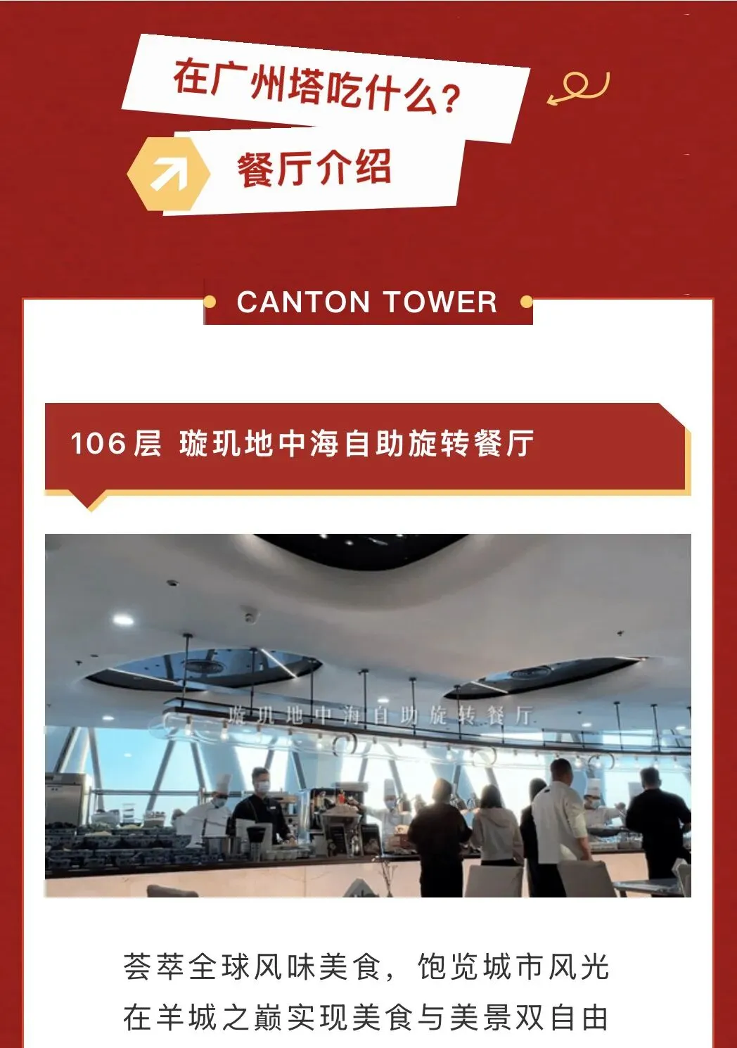 · 璇玑地中海自助餐厅(106层):旋转餐厅设计,在享用美食的同时360度欣赏城市美景;
