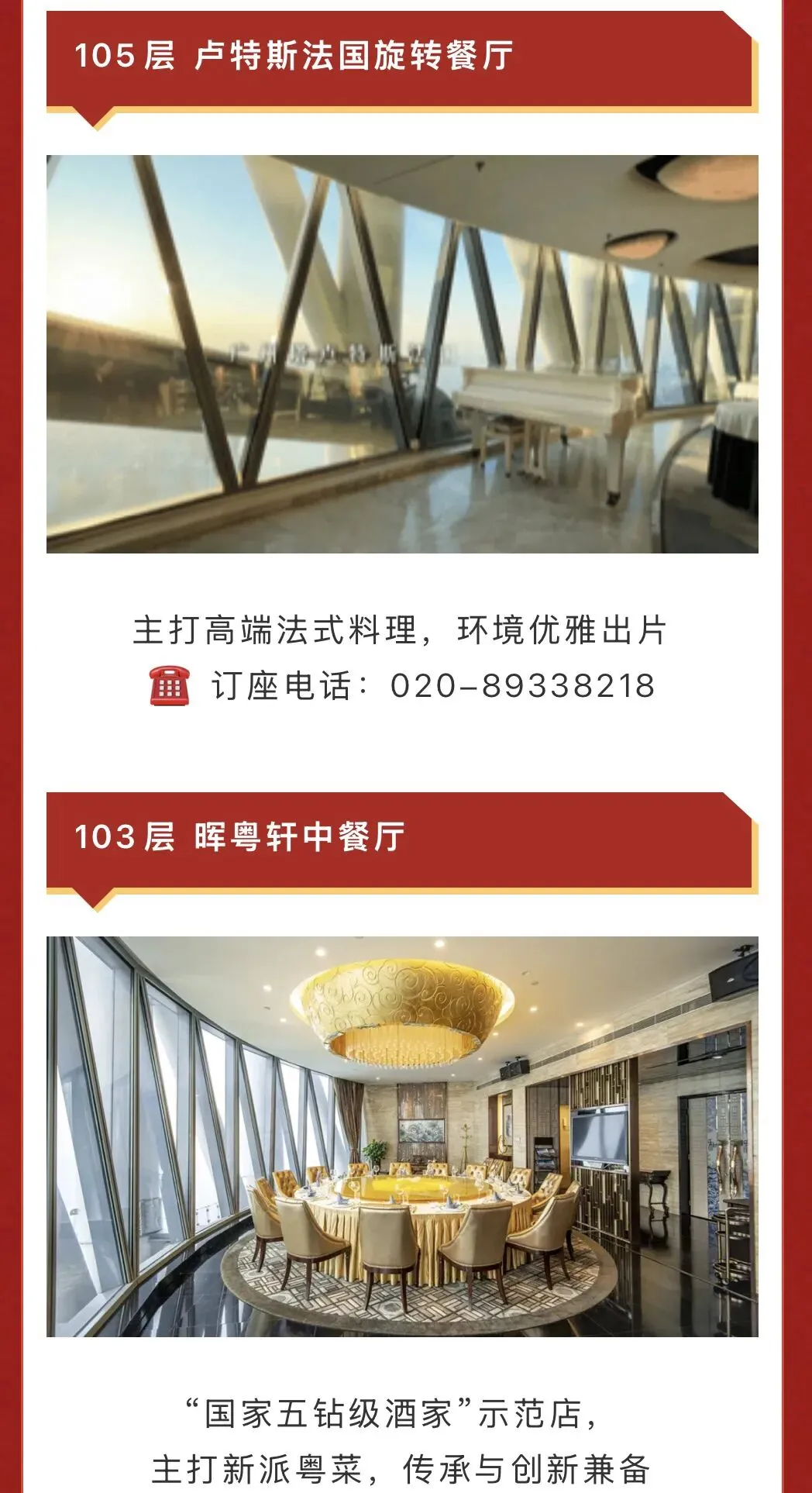 · 晖粤轩(105层):提供地道粤菜,环境雅致,适合商务宴请和家庭聚餐;