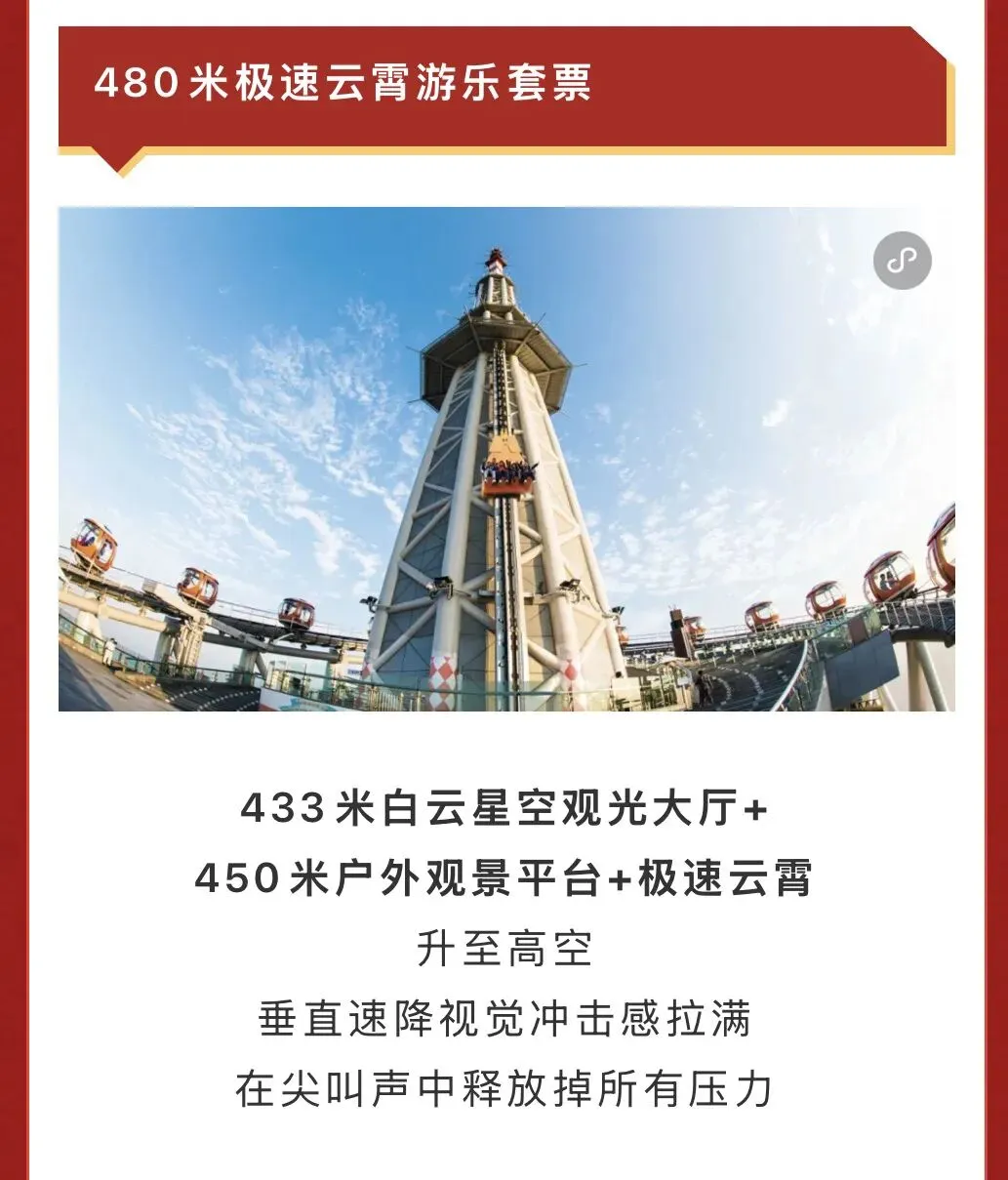 包含433米白云星空观光大厅、450米户外观景平台以及极速云霄。如果你追求刺激、想要释放压力,这个套票绝对适合你!升至高空后,突然垂直速降,视觉冲击感瞬间拉满。在极速下坠的过程中,所有的压力仿佛都随着尖叫声释放而出,那种酣畅淋漓的快感让人回味无穷。这不仅是游乐项目,更是一次心灵的释放之旅。