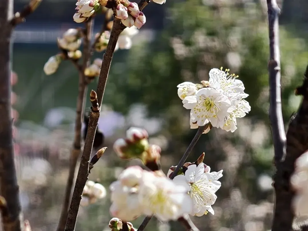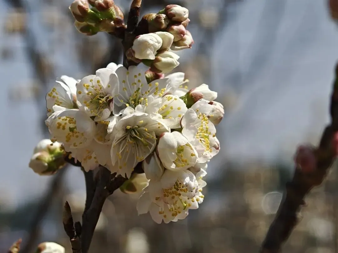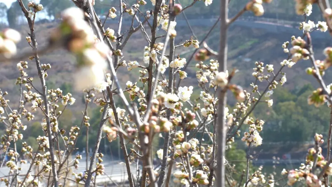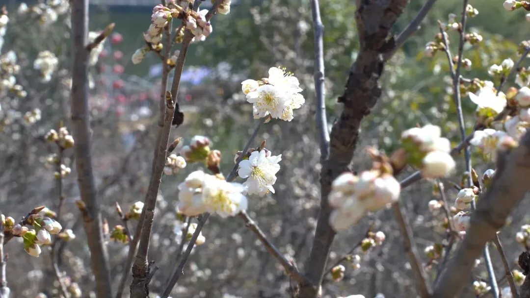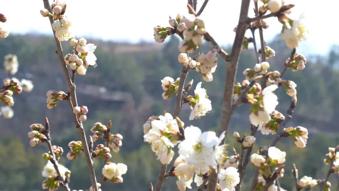 而在不远处向阳光的山坳里,零星几棵樱桃花已经开花,洁白的花瓣在枝头悄然绽放,宛如春的信使,提前捎来了山野复苏的讯息。这几株抢先绽放的樱桃花,虽不成规模,却足以让人心生期待。它们静静地开在山坳里,与远处热闹的场面共同构成了一幅动静相宜的新春画卷,仿佛告诉每一个到来的人:春天,真的来了!