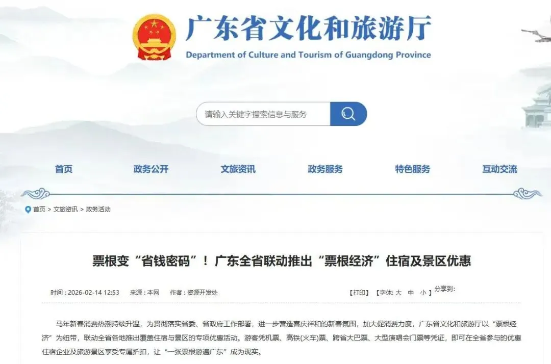 广东推出“票根经济”住宿及景区优惠。游客凭机票、高铁(火车)票、跨省大巴票、大型演唱会门票等凭证,即可在全省参与的优惠住宿企业及旅游景区享受专属折扣。