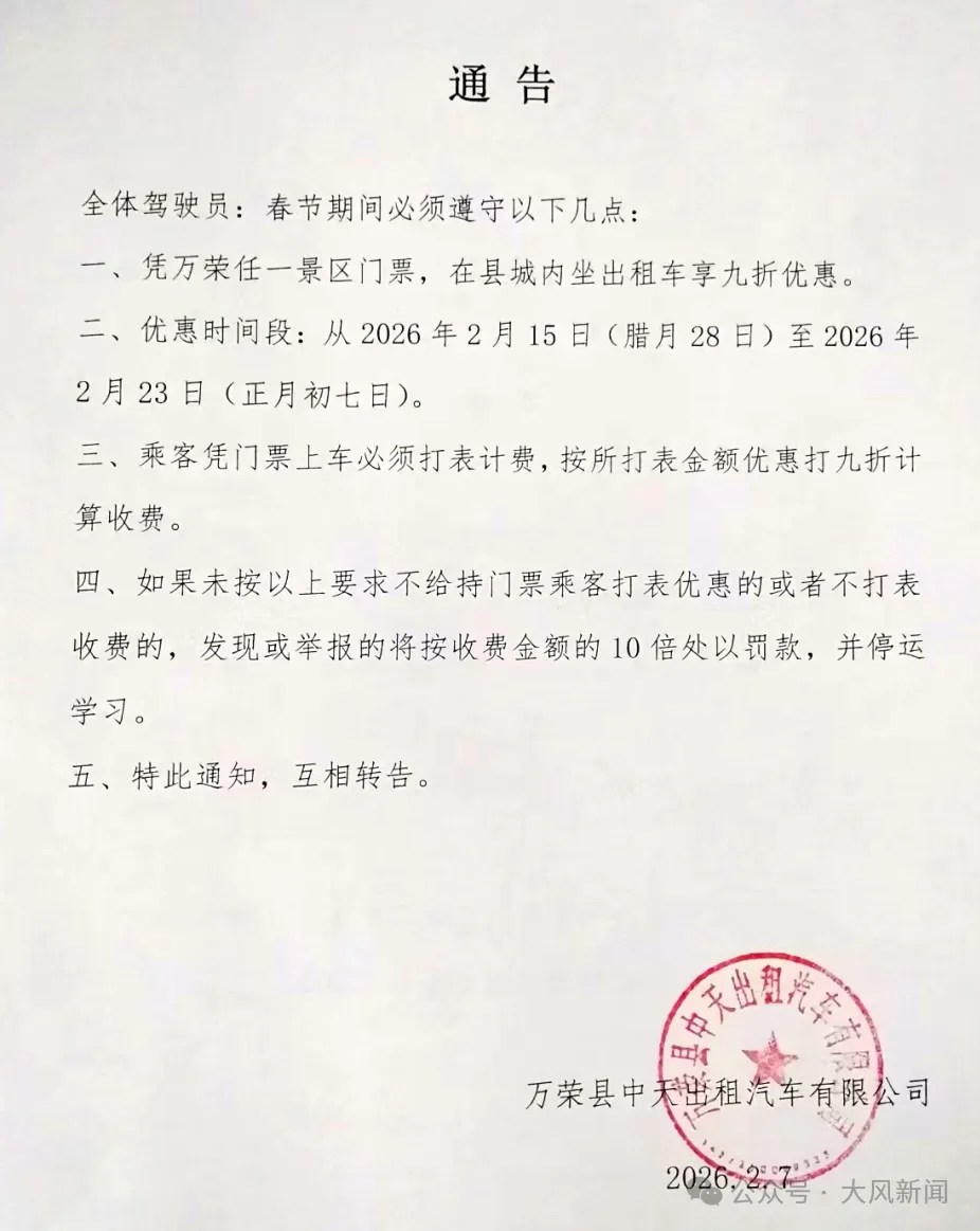 山西万荣县要求出租车给持景区门票游客打九折,司机:不优惠10倍罚款,县文旅局:没司机补贴政策,出租车公司:义务活动,不参加不合适