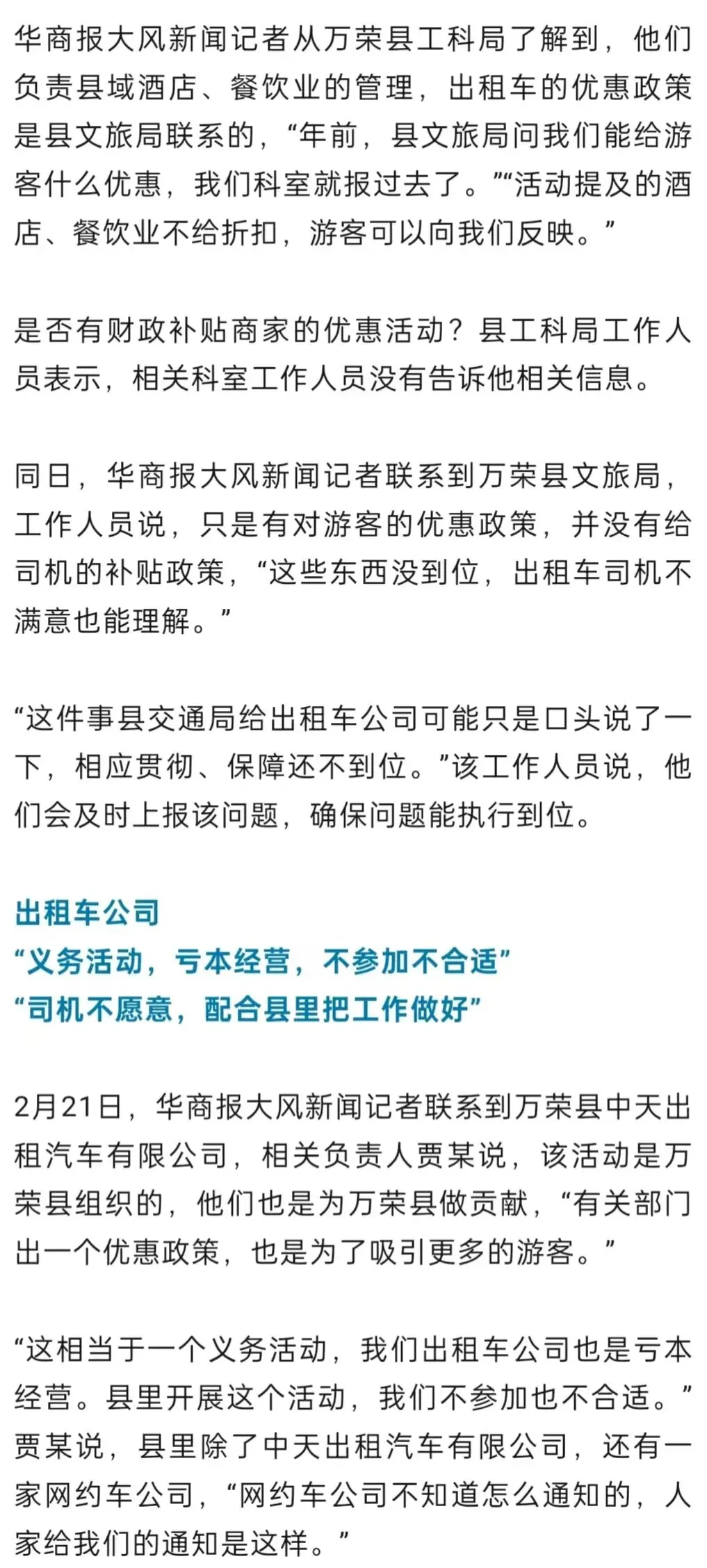 贾某表示,他们的通知是县交通局发的,县交通局是收到县文旅局通知的,“司机们不愿意,但咱们得配合县里把工作做了。”“我们也知道实际生意不行,赚不了几个钱,逢年过节顾客能多一些。按理优惠政策应该给一些补贴,但有关部门没有这方面的资金支持。”