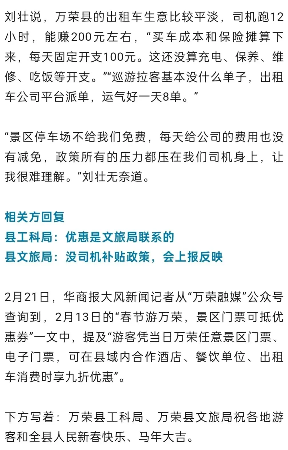 “都说万荣县春节期间接待游客的政策好,我却怎么也高兴不起来。”出租车司机刘壮(化名)无奈道,县里要求出租车给持景区门票的游客打九折,这钱却是司机们自己出,“如果没打折被投诉,我会被10倍罚款。”