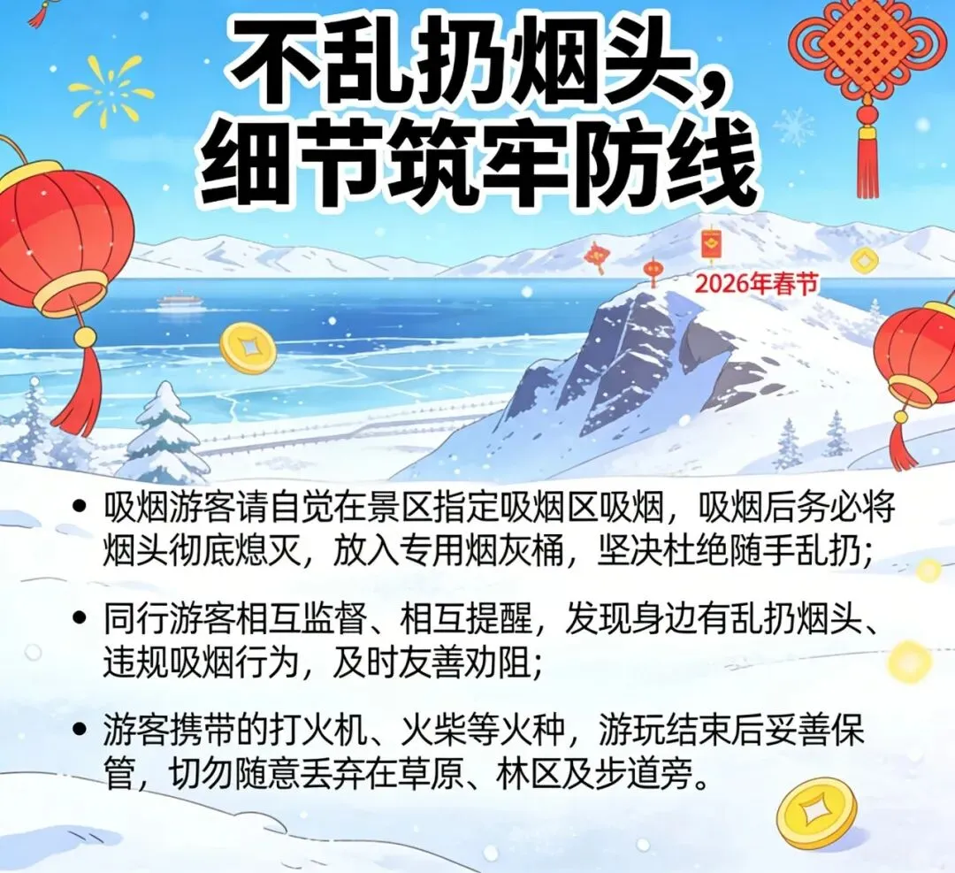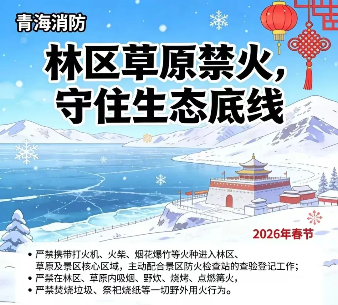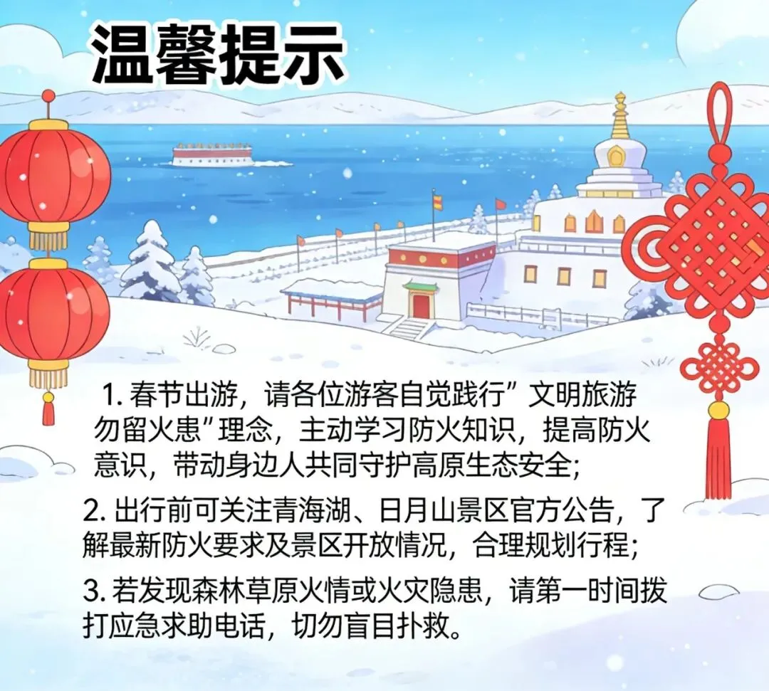 当前正值冬春季森林草原防火关键期,青海湖周边广袤草原、日月山林区草木枯萎、天干物燥,加之春节期间游客激增、祭祀用火等风险隐患增多,火险等级持续偏高。为切实守护景区生态安全和每一位游客的平安旅途,海南州消防救援支队特发布“文明旅游 勿留火患”专项消防安全提示,请全体游客、民宿经营者牢记于心、践行于行!