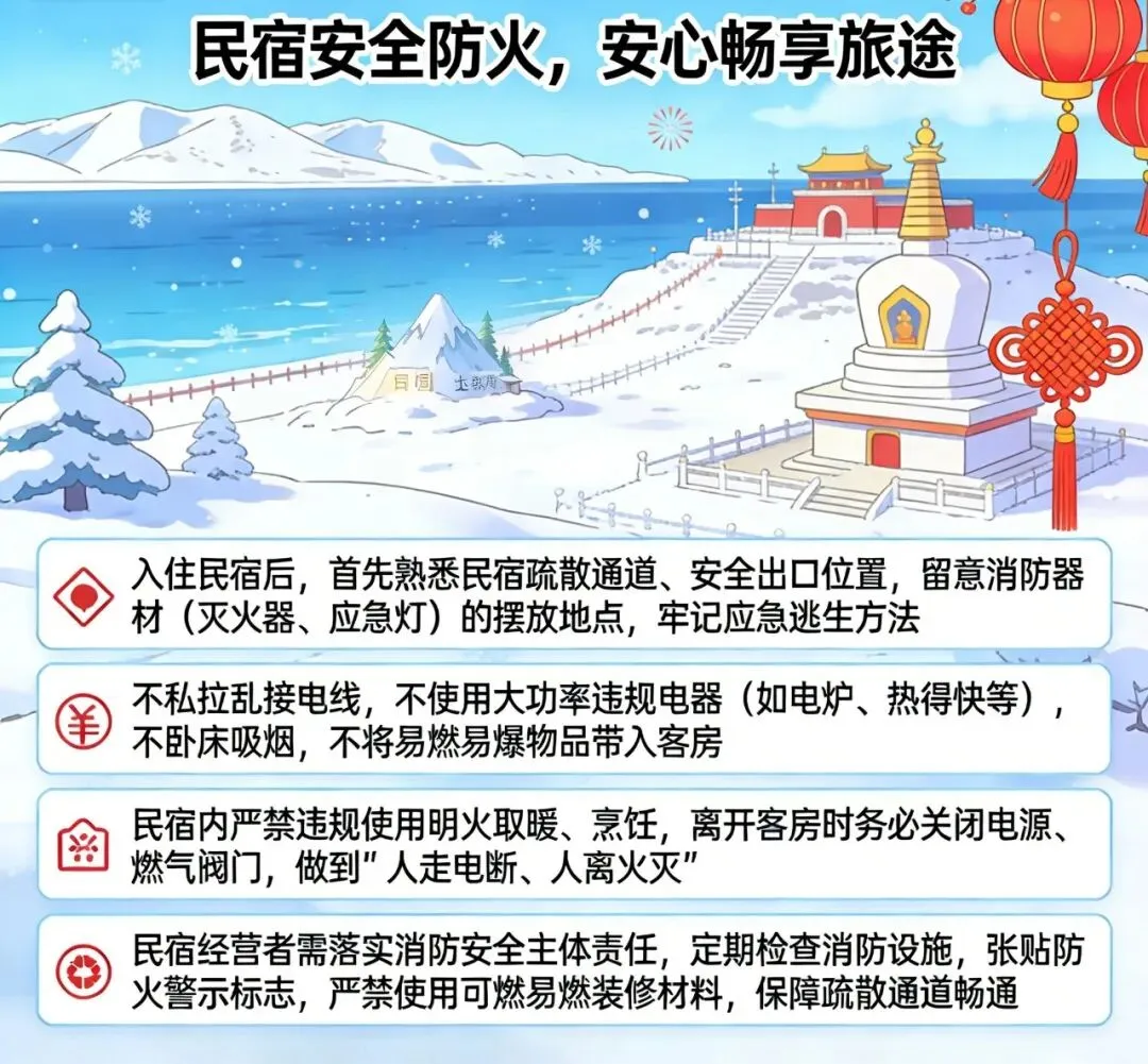 春节期间,青海湖、日月山景区周边民宿客流激增,用火用电频率大幅加大,消防安全隐患不容忽视。为保障大家的居住安全,海南州消防救援支队提醒民宿经营者、入住游客,务必牢记以下防火要点: