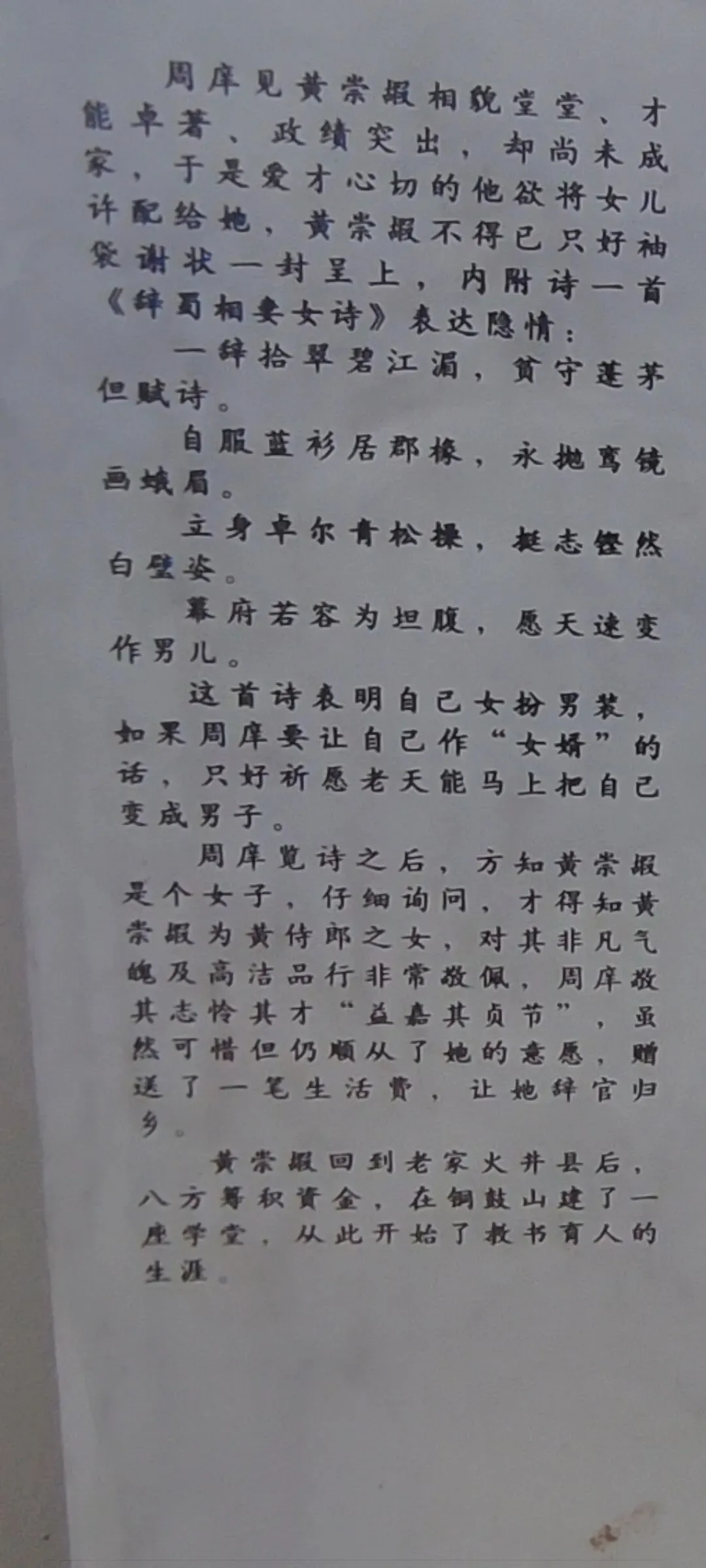 周庠读后亲自复审,终明其冤,当即释放。见她英俊儒雅、应对敏捷,周庠遂聘其入书院执教。此时黄崇嘏十九岁,并于教书之余考中举人。