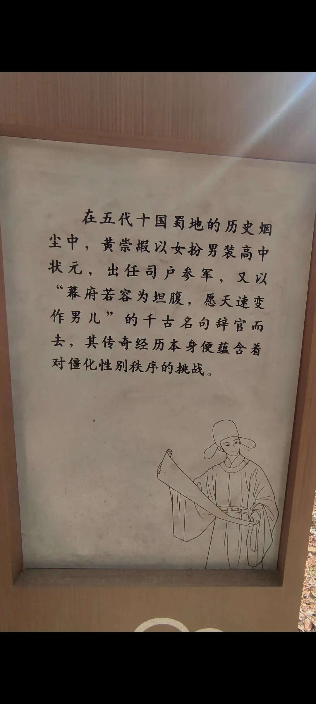 在五代十国蜀地的历史烟尘中,黄崇嘏以女扮男装高中状元,出任司户参军,又因“幕府若容为坦腹,愿天速变作男儿”的千古名句辞官而去,其传奇经历本身便蕴含着对僵化性别秩序的挑战。