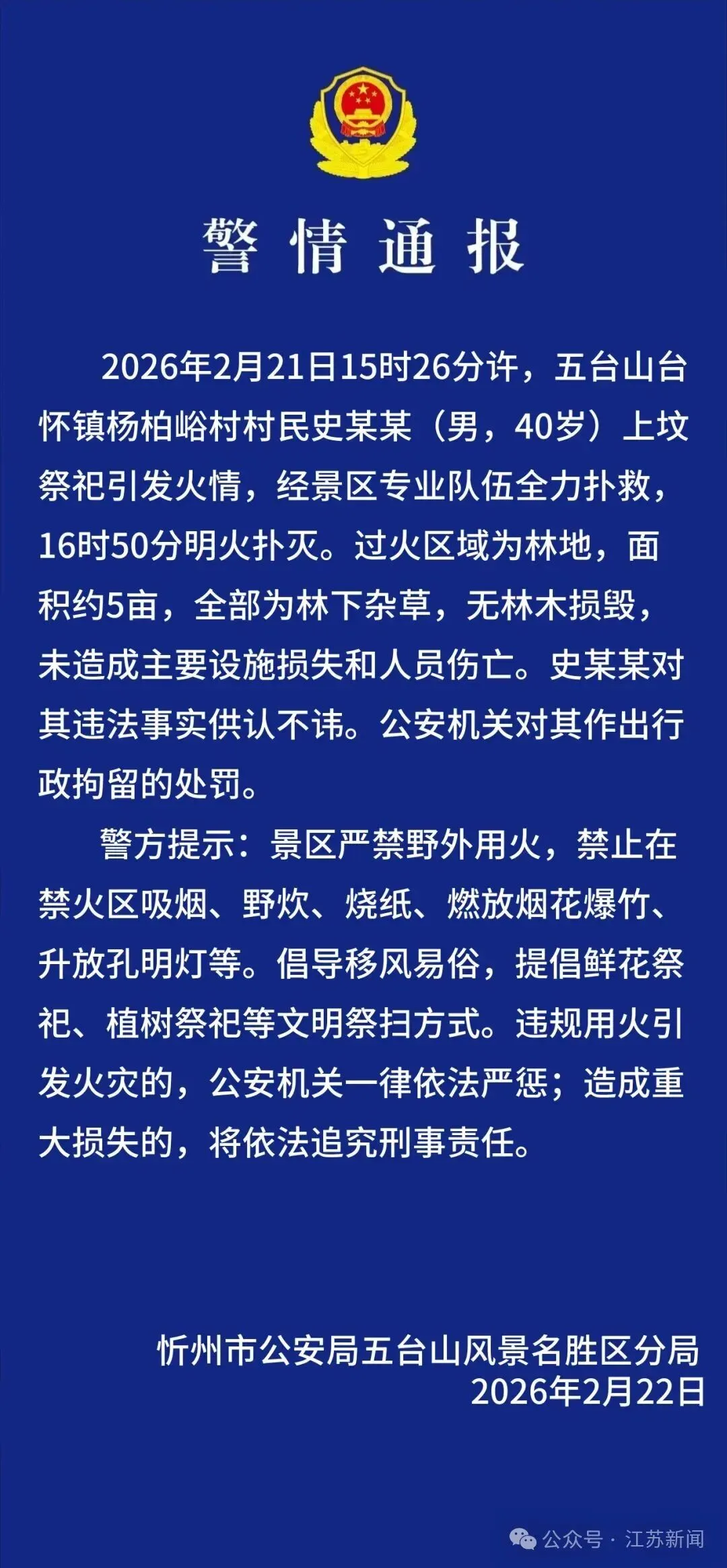 2月22日,山西忻州市公安局五台山风景名胜区分局发布警情通报:2026年2月21日15时26分许,五台山台怀镇杨柏峪村村民史某某(男,40岁)上坟祭祀引发火情,经景区专业队伍全力扑救,16时50分明火扑灭。过火区域为林地,面积约5亩,全部为林下杂草,无林木损毁,未造成主要设施损失和人员伤亡。史某某对其违法事实供认不讳。公安机关对其作出行政拘留的处罚。